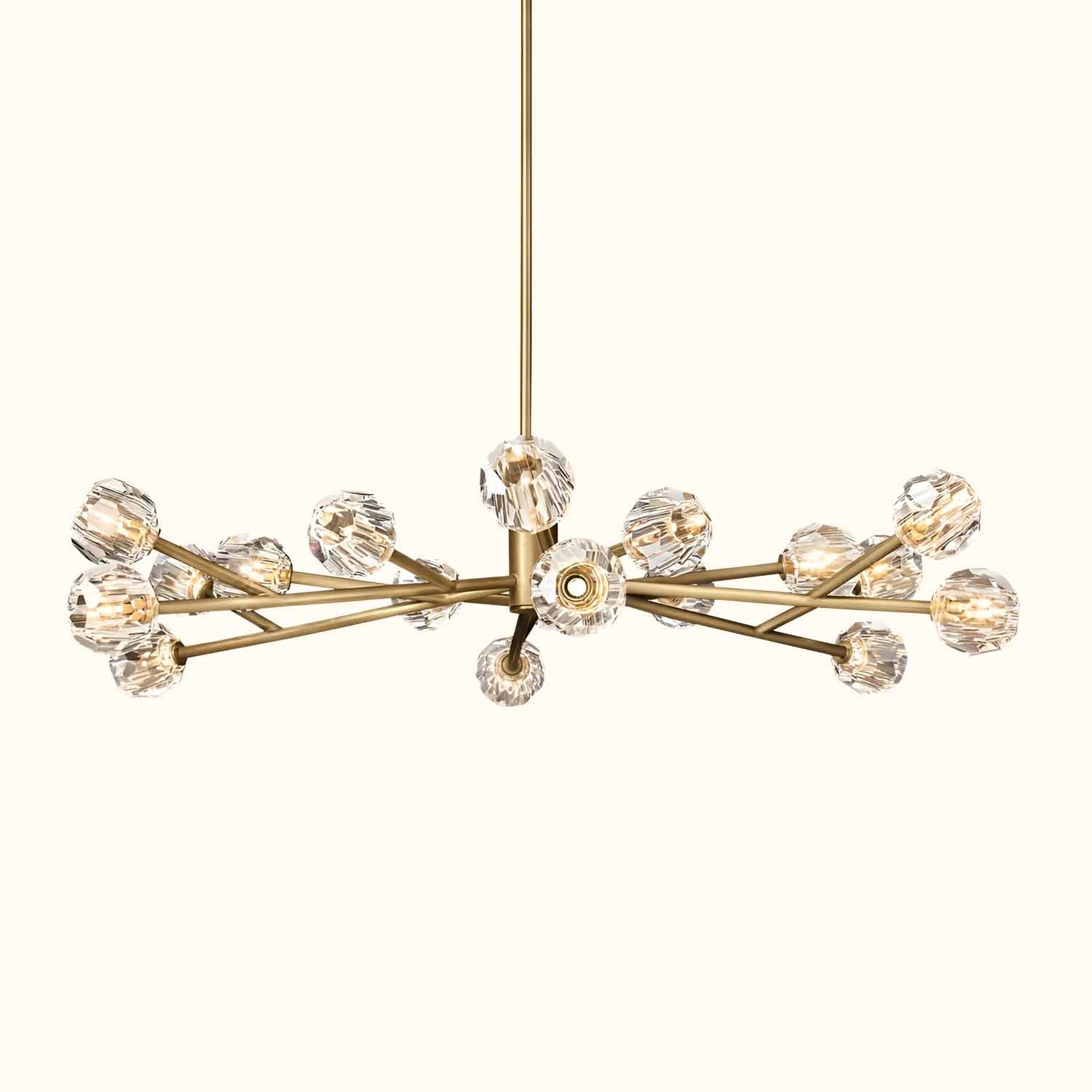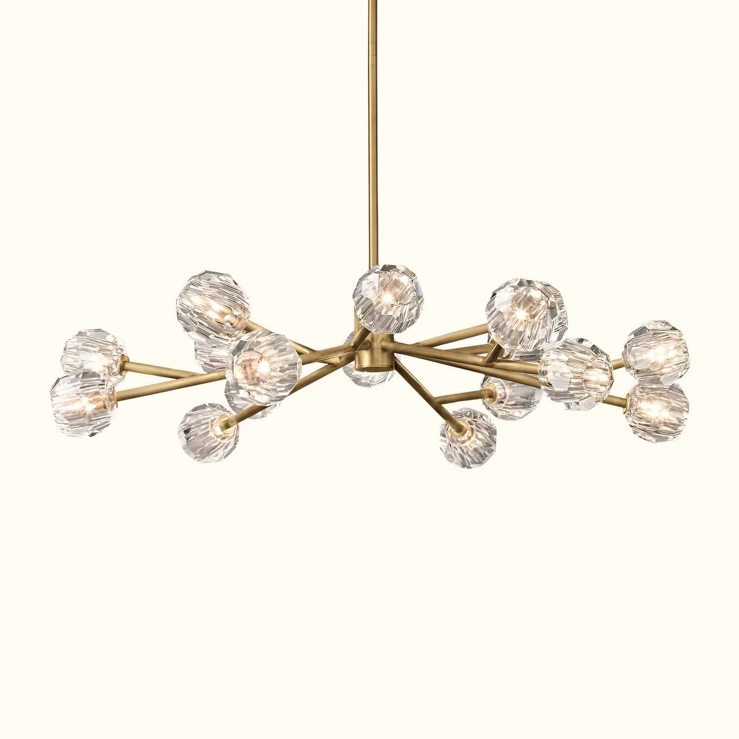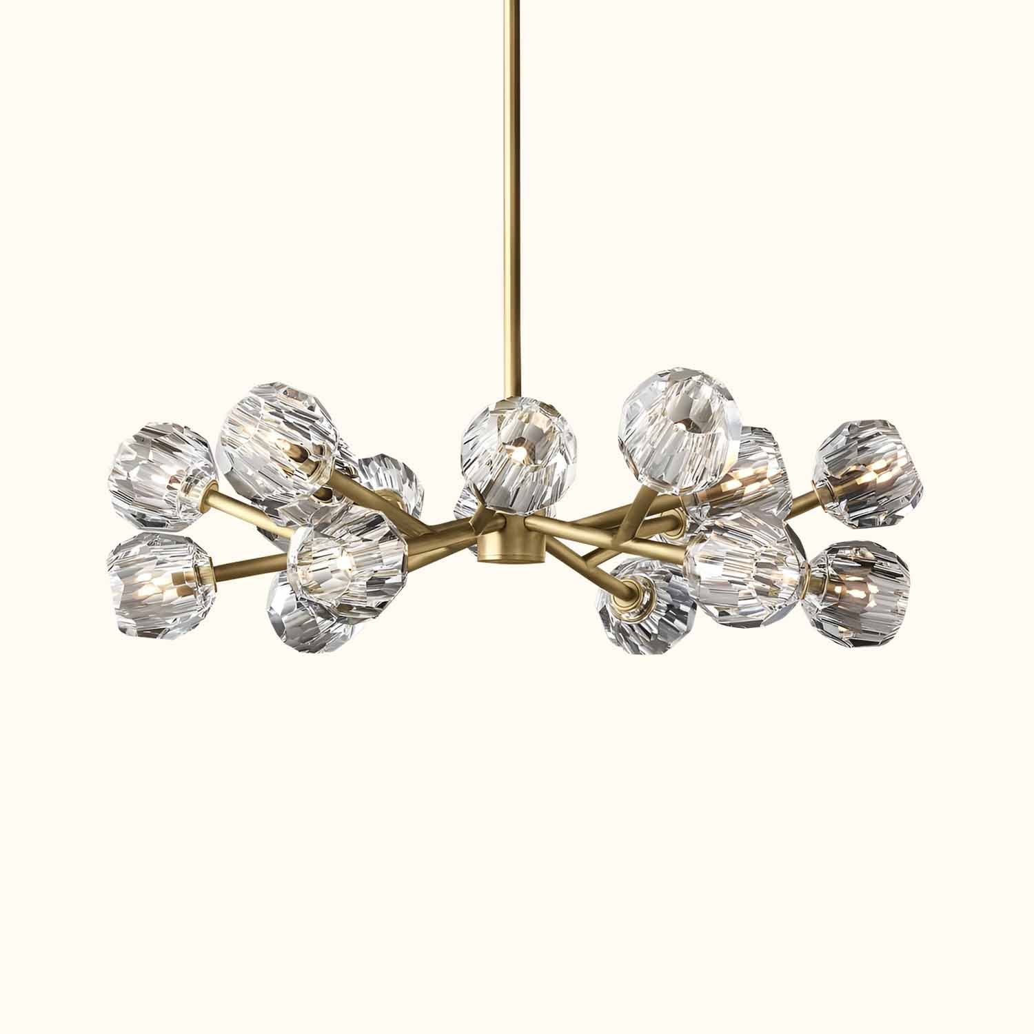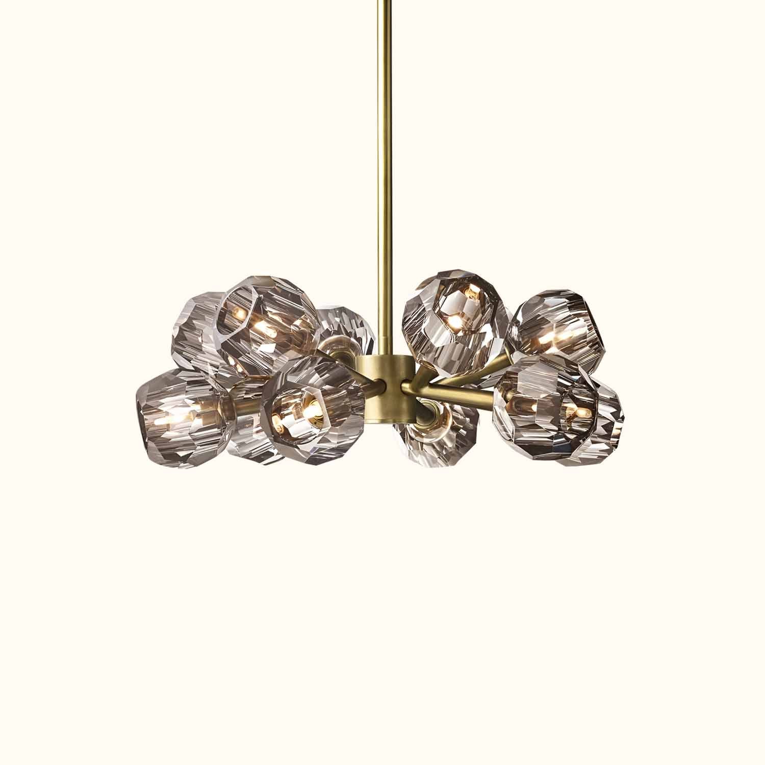 This sculptural fixture, designed by lighting designer, is crafted from solid brass and crystal glass, showcasing his passion for luxurious materials and superior craftsmanship. Each finely faceted sphere is ground and polished by hand to reflect and refract light, evoking the minimalist spirit of 1960s design.