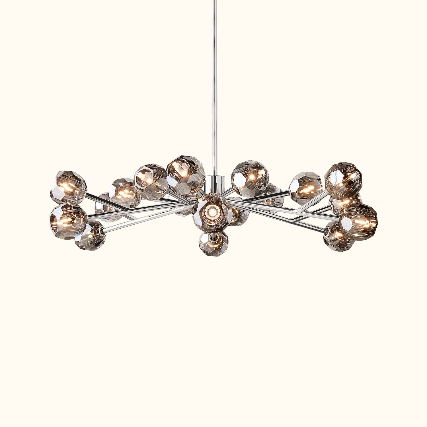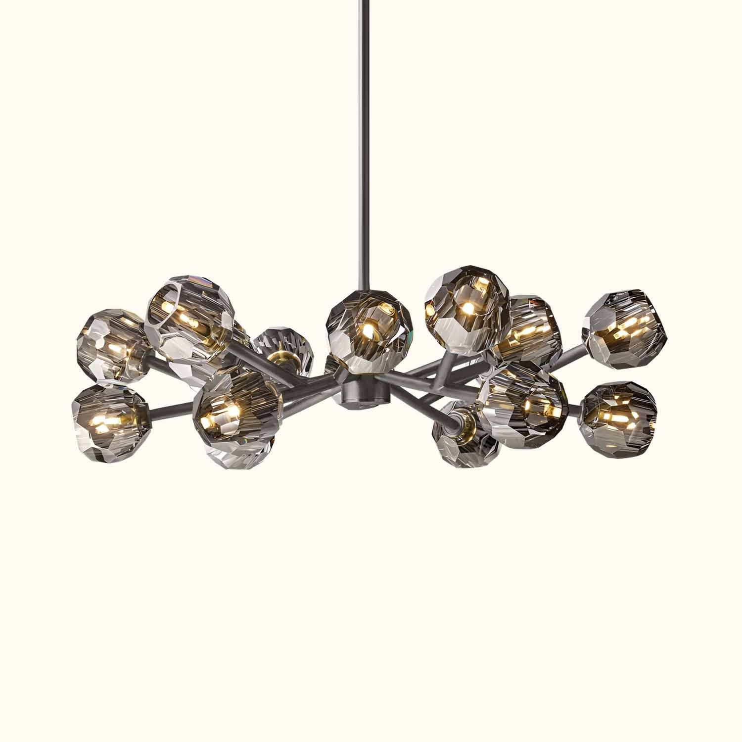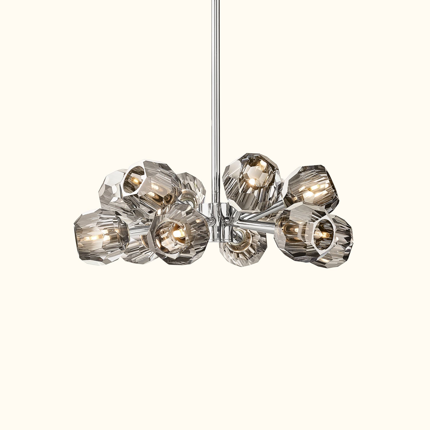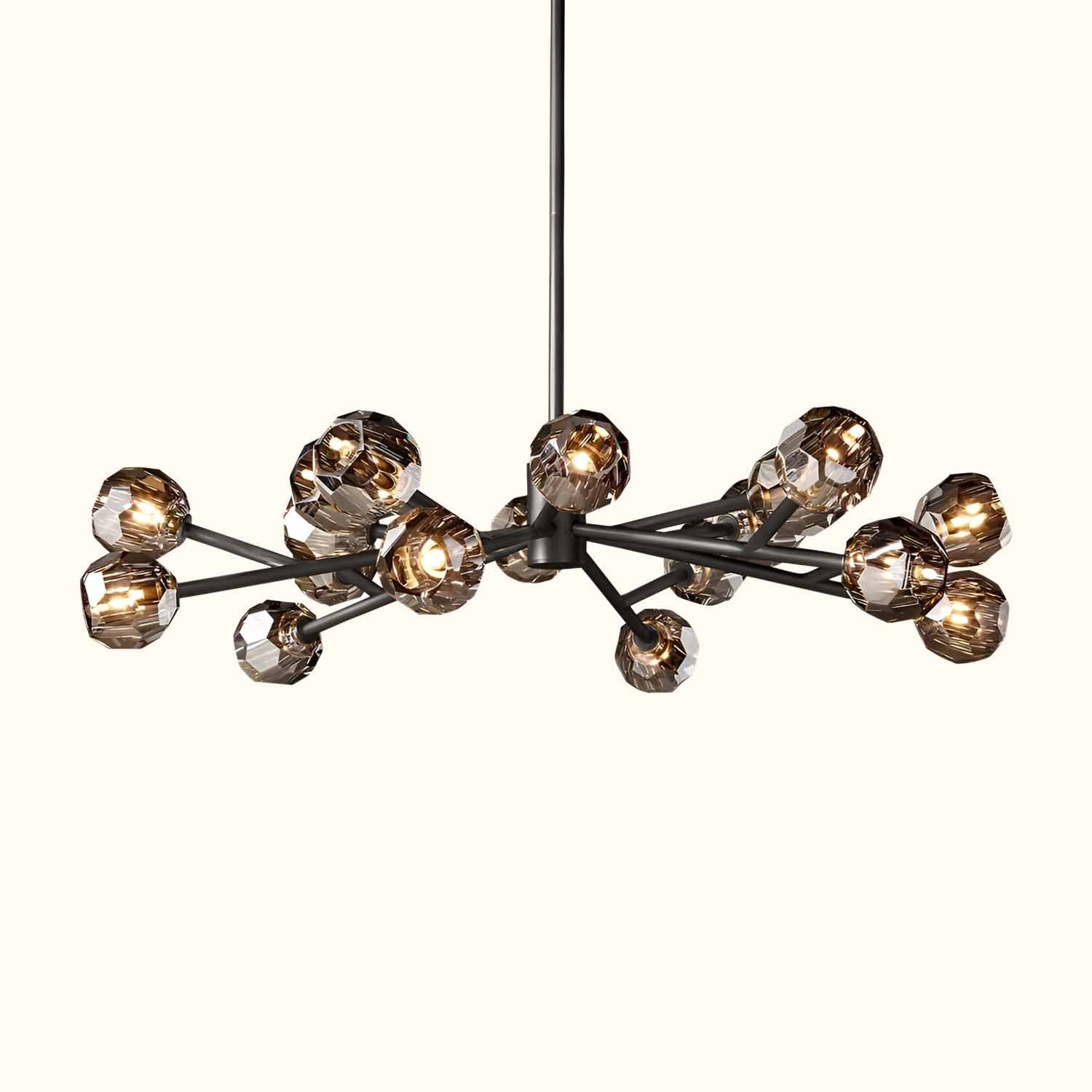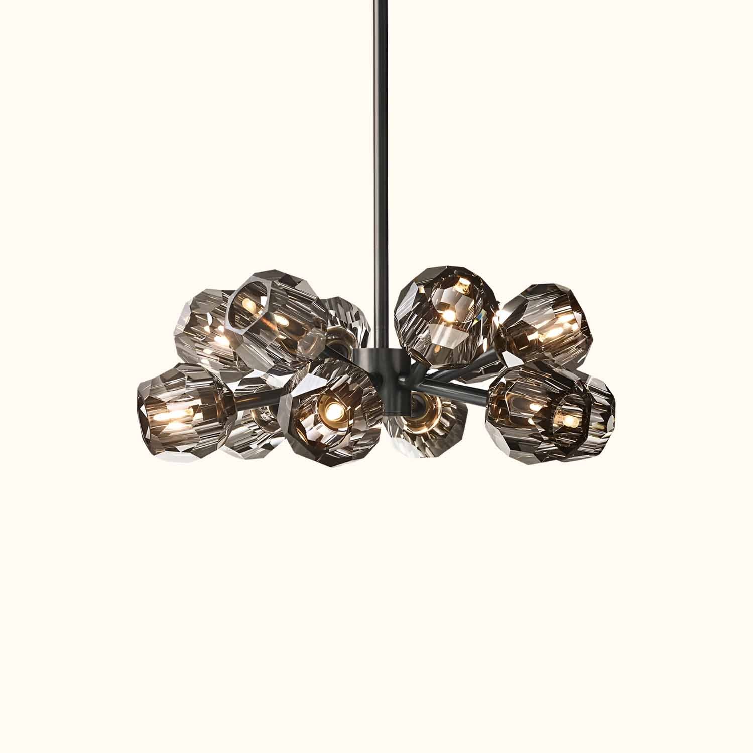 This sculptural fixture, designed by lighting designer, is crafted from solid brass and crystal glass, showcasing his passion for luxurious materials and superior craftsmanship. Each finely faceted sphere is ground and polished by hand to reflect and refract light, evoking the minimalist spirit of 1960s design.