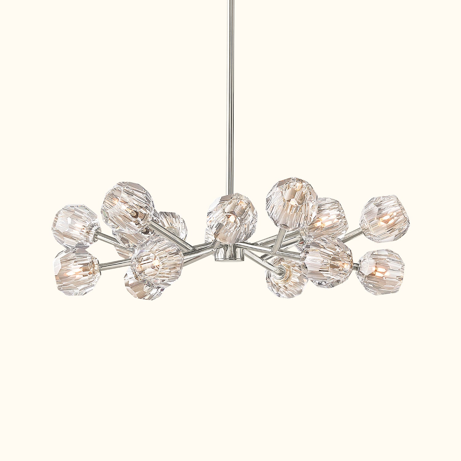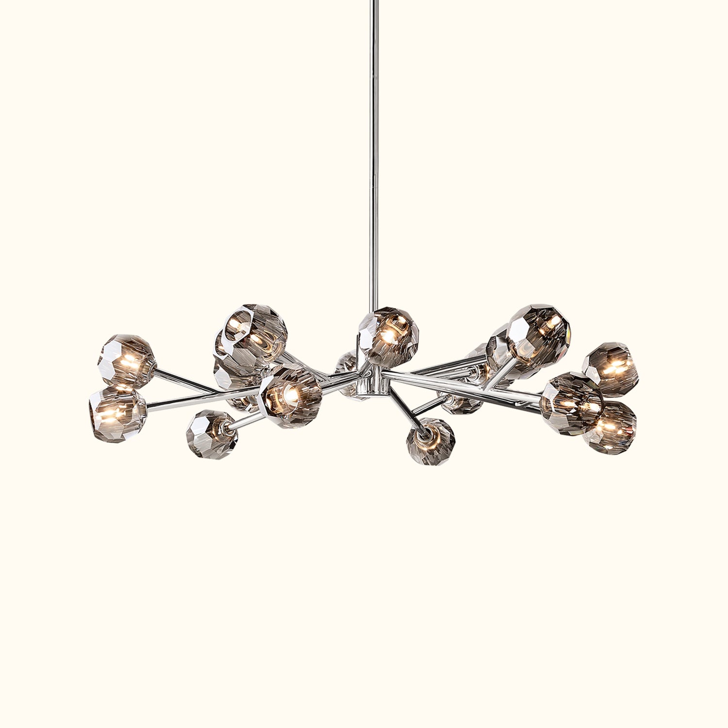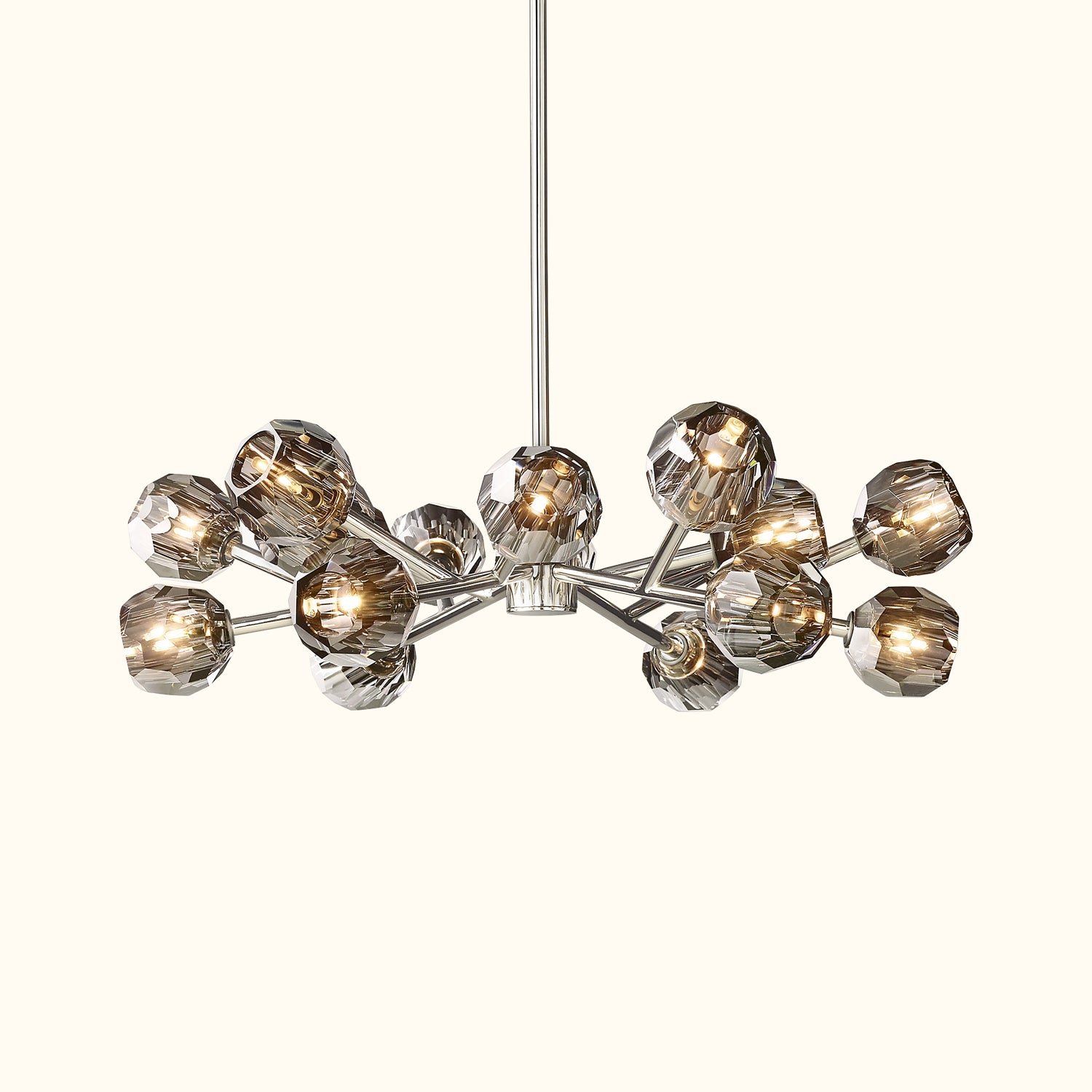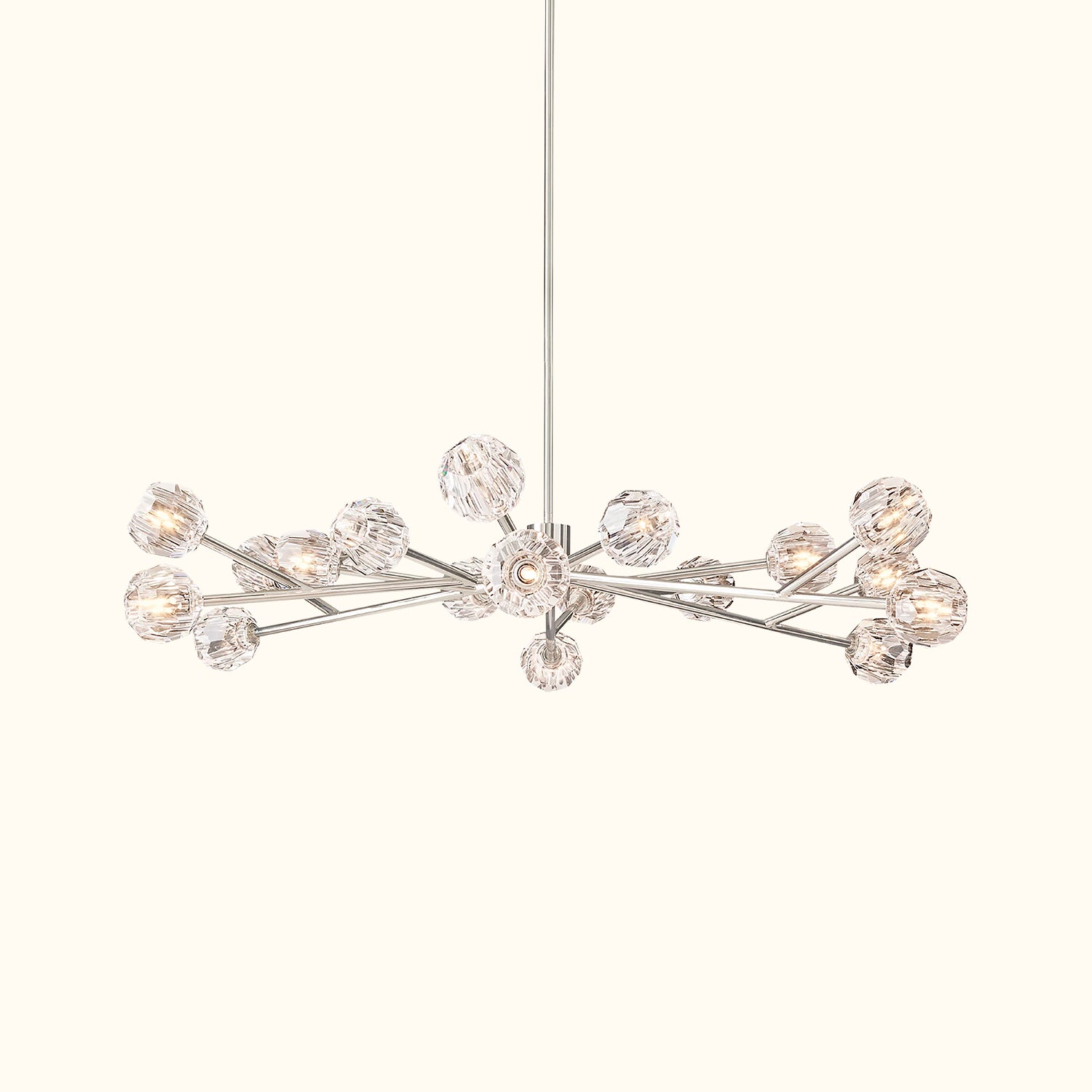 This sculptural fixture, designed by lighting designer, is crafted from solid brass and crystal glass, showcasing his passion for luxurious materials and superior craftsmanship. Each finely faceted sphere is ground and polished by hand to reflect and refract light, evoking the minimalist spirit of 1960s design.