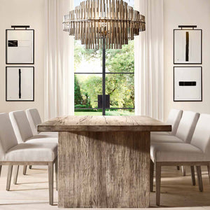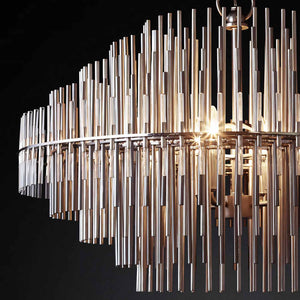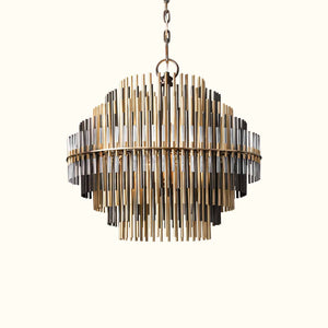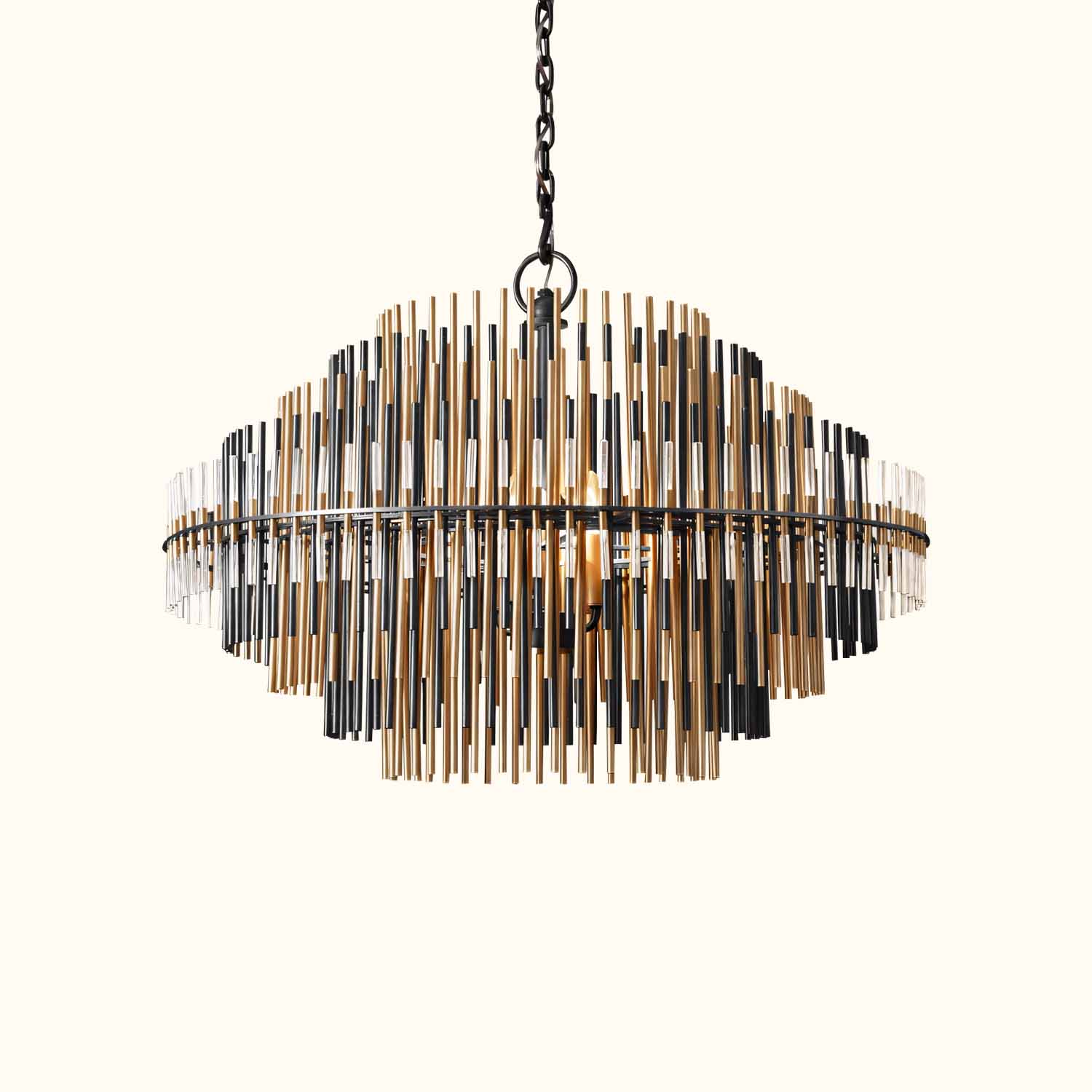 The profile of our chandelier is composed of ascending and descending concentric spires, inspired by a 1970s design. Multiple tiers of graduated metal and acrylic rods diffuse the soft glow of LEDs, giving the piece a sculptural presence.