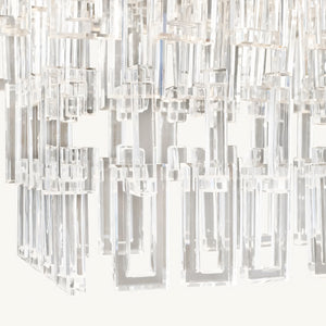 Inspired by industrially processed metal chains, the designers reimagined the interlocking open and closed links in stunning crystal glass. Pure and simple, the stylized links are suspended from more than 600 crystals and wire-free to create a brilliant waterfall of shimmering light.