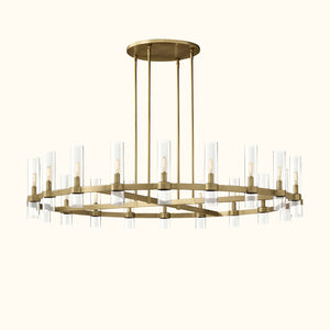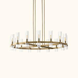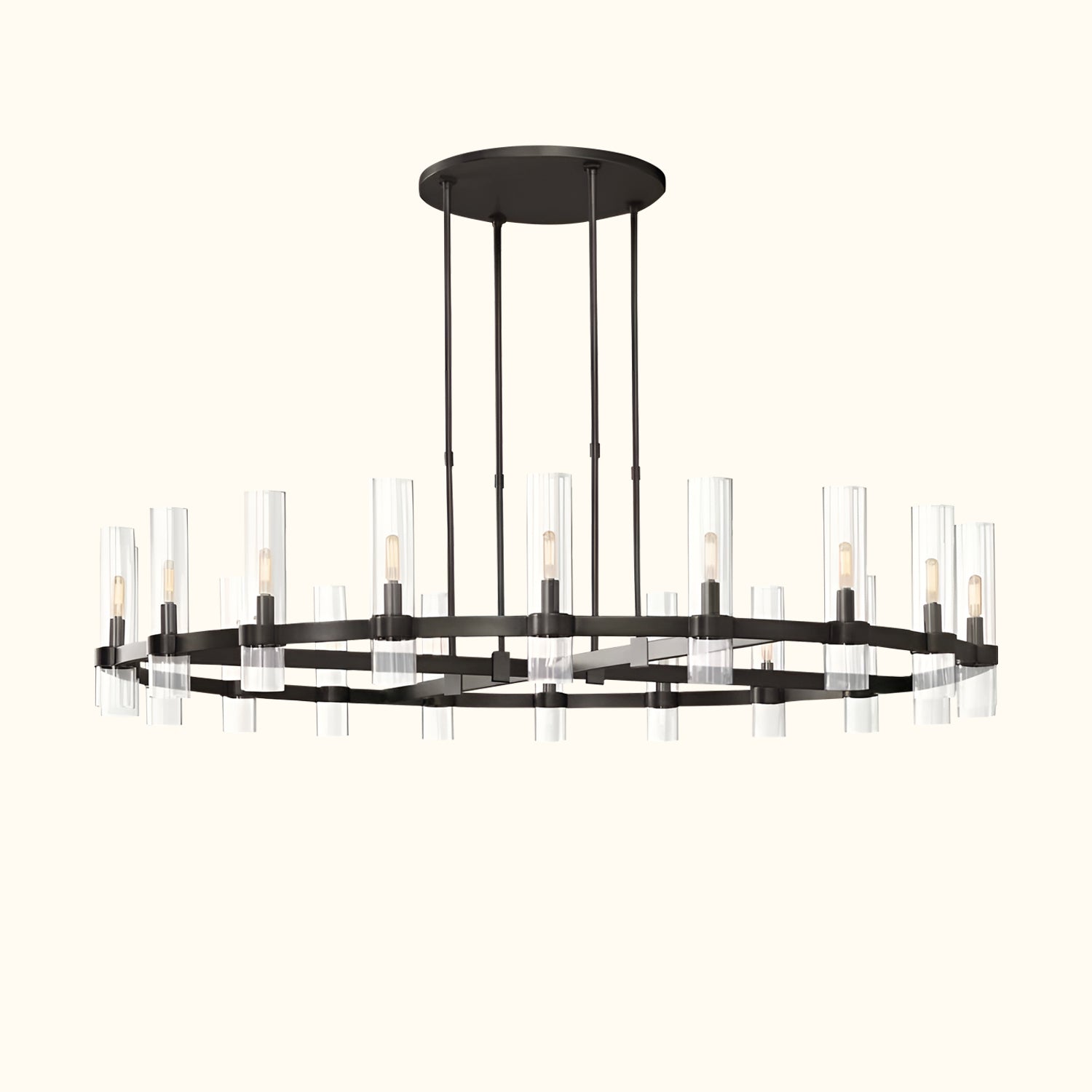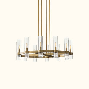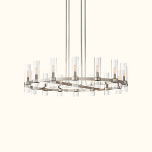 A renowned lighting designer reimagines Art Deco forms with a modern minimalist sensibility in this collection. Crafted from solid steel, unadorned metal bands securely hold the slender glass cylinders in place, maintaining perfect balance. Inside each shade, Edison bulbs glow like flickering candles.