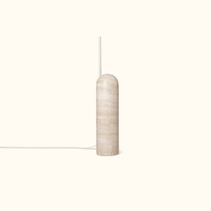 Our floor lamp features a striking design characterized by an asymmetrical shade positioned on a slender metal rod and a limestone base. The curved petal-shaped shade is painted white to evenly distribute soft ambient light. Use it to brighten dark corners or place it beside a lounge chair to highlight your favorite book, adjusting the shadow to the perfect angle.