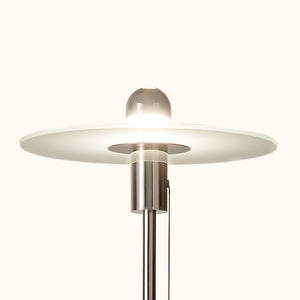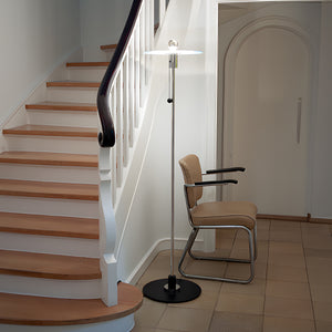 The light source itself is a unique design feature—a bare incandescent bulb with a mirrored dome, which had just been invented at the time. The light is directed downward, making the light source appear dim. The light is absorbed and refracted by etched frosted glass, making it seem like a shiny layer floating above a thin nickel-plated metal tube.This lamp was showcased as an example of functional design in Issue 7 of the Bauhaus book, published in 1925. The only original model was exhibited in the experimental house called “Am Horn,” but unfortunately, it has since been lost.