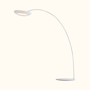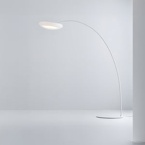 The floor lamp resembles a glowing cloud, suspended at the end of a curved lamp pole, adorned with winding, natural lines for a pleasing effect. The light source is fully integrated, emitting a soft and diffused glow.