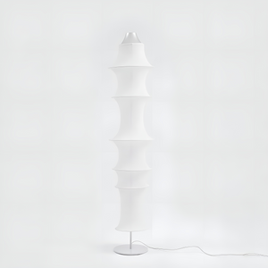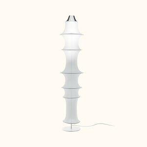 The floor lamp features a spontaneous shape achieved by the contrasting forces of its components: the tension of a stretched tube of finely woven fabric and the weight of seven different sized metal rings. A single light bulb and aluminum reflector illuminate the curves of the fabric.