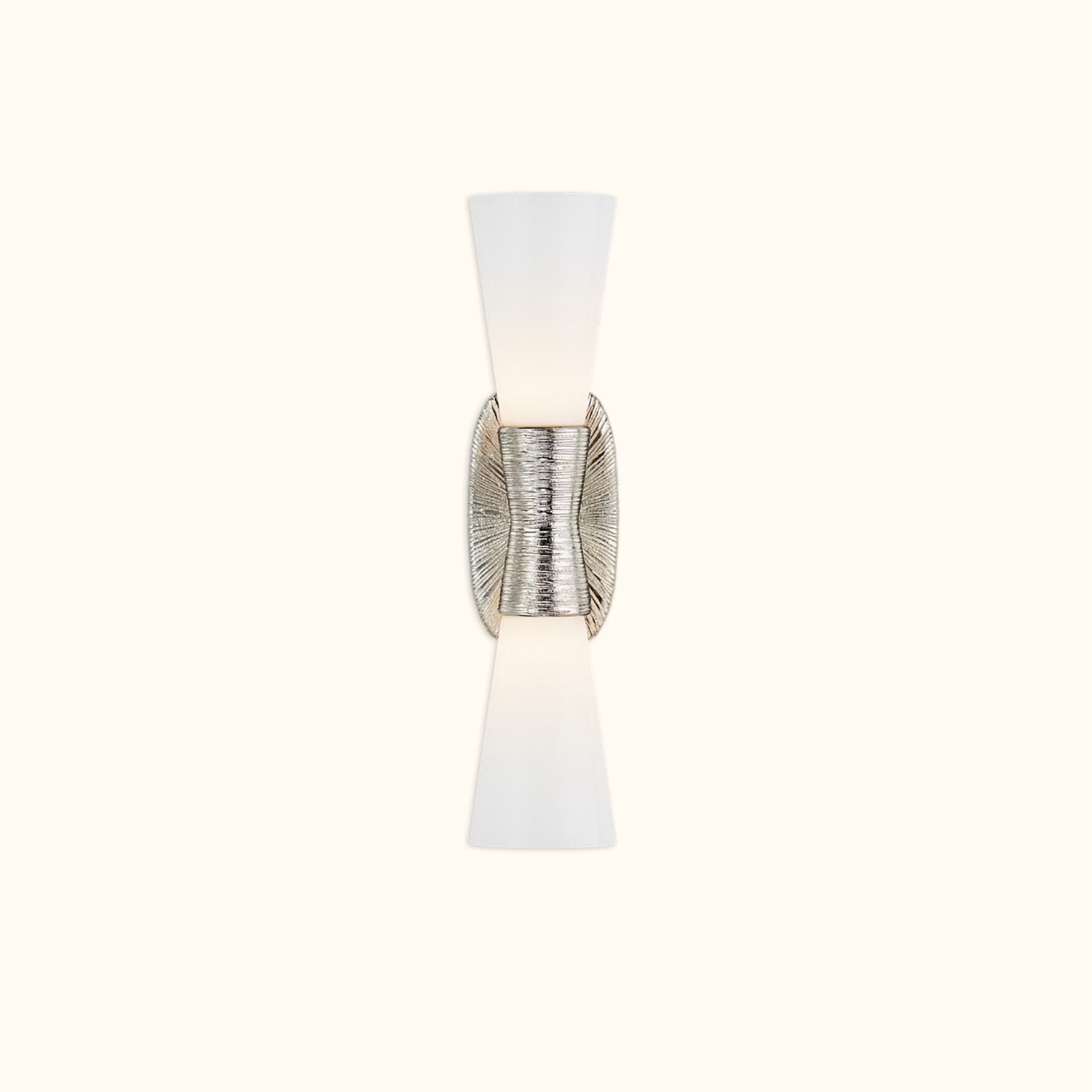 Utopia draws inspiration from the California coastline. Wall sconces, chandeliers, lighting fixtures, and recessed brackets transform the landscape's terrain textures and organic forms into carved, striped metals with various finishes, featuring white or broken glass, offering endless decorative possibilities.