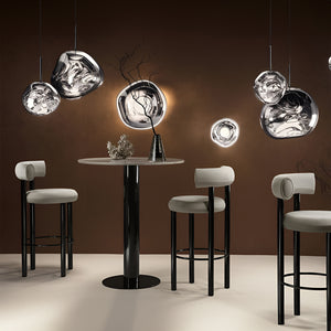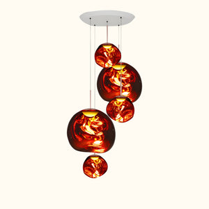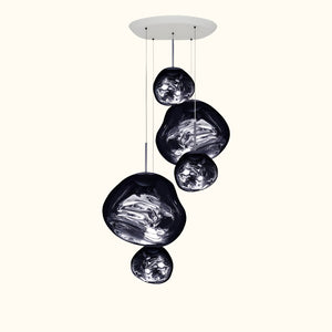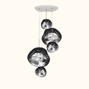 This extraordinary chandelier features five Melt Mini ceiling lights in a modern smoked finish. Featuring our integrated LED modules, this ceiling light creates a mesmerizing molten heat-blown glass effect when on and a mirror effect when off. Made in Germany using high-tech manufacturing techniques to create a perfect molten sphere.