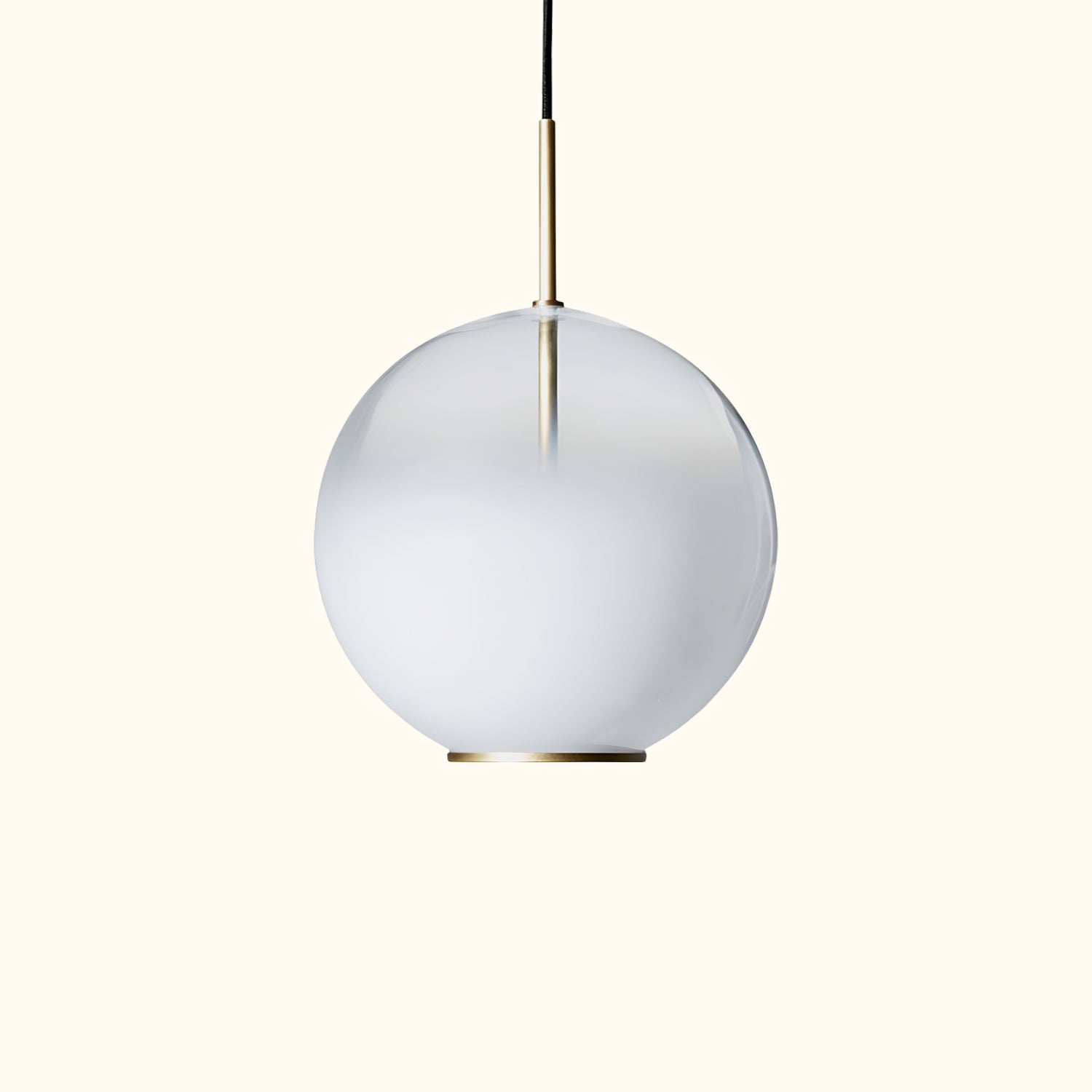 Suspended lamp with diffused light. Natural brushed burnished brass structure and white gradient blown glass diffuser.