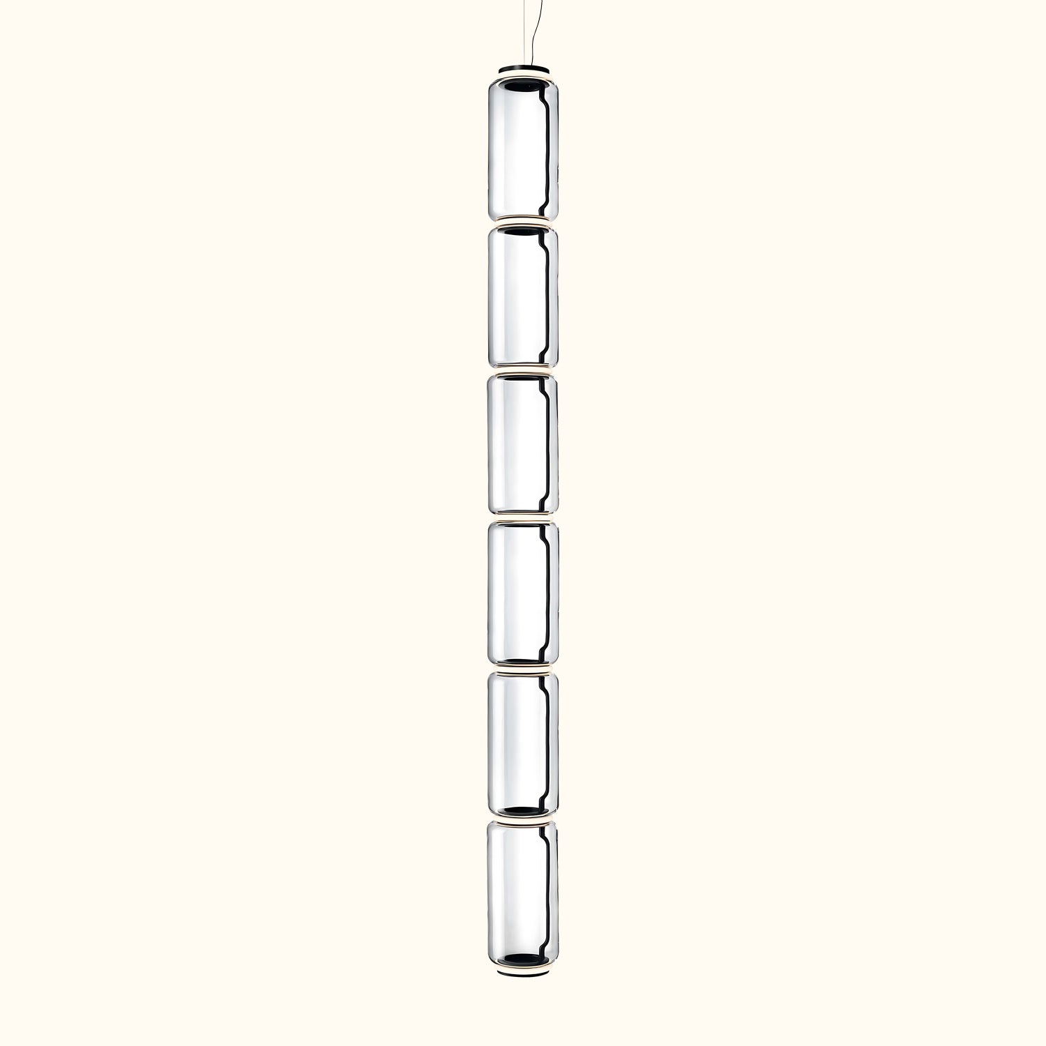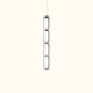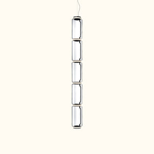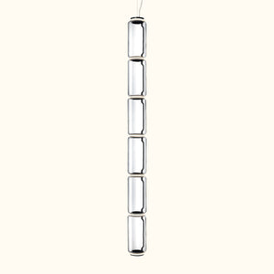 The pendant lamp consists of interconnected glass modules, with a total length of 3.2 meters (126.77") and a 4-meter (157.48") suspension power cable. It features cylindrical and hemispherical transparent blown-glass structures, suspended die-cast aluminum ring connectors, hydraulically formed steel internal side arms, and injection-molded optical opaline silicone outer ring diffusers.