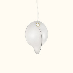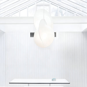 The pendant light features diffuse lighting. The internal structure is made of white powder-coated steel, and the resin diffuser is coated over the structure.