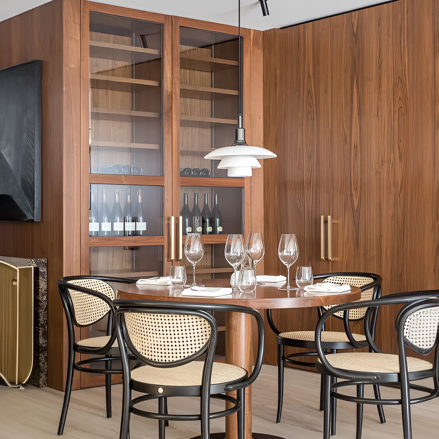 The fixture is designed based on the principle of a reflective three-shade system, directing most of the light downwards. The shade is made of hand-blown opal three-layer glass, with a glossy surface on the top and a sandblasted matte finish on the underside, resulting in a soft and even light distribution.