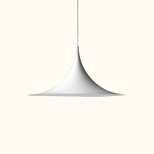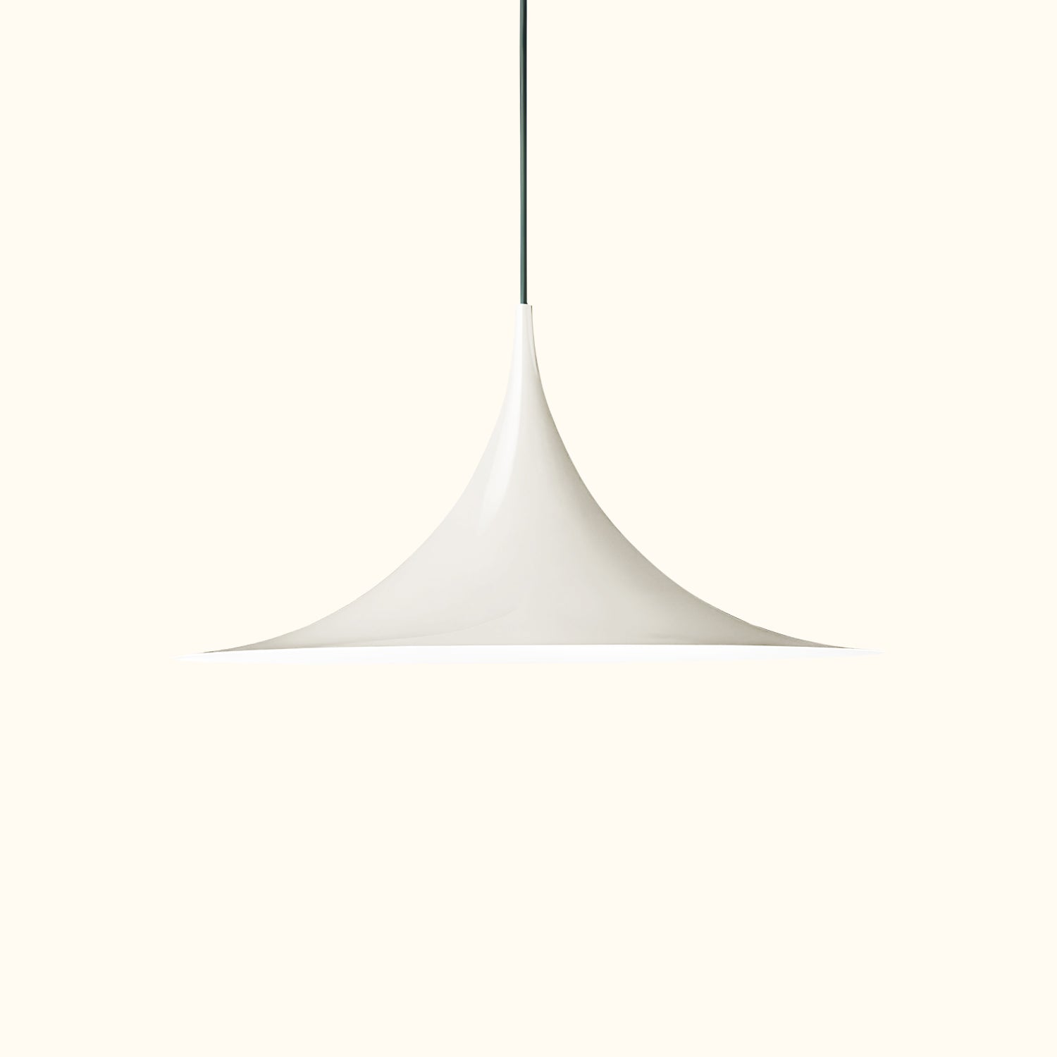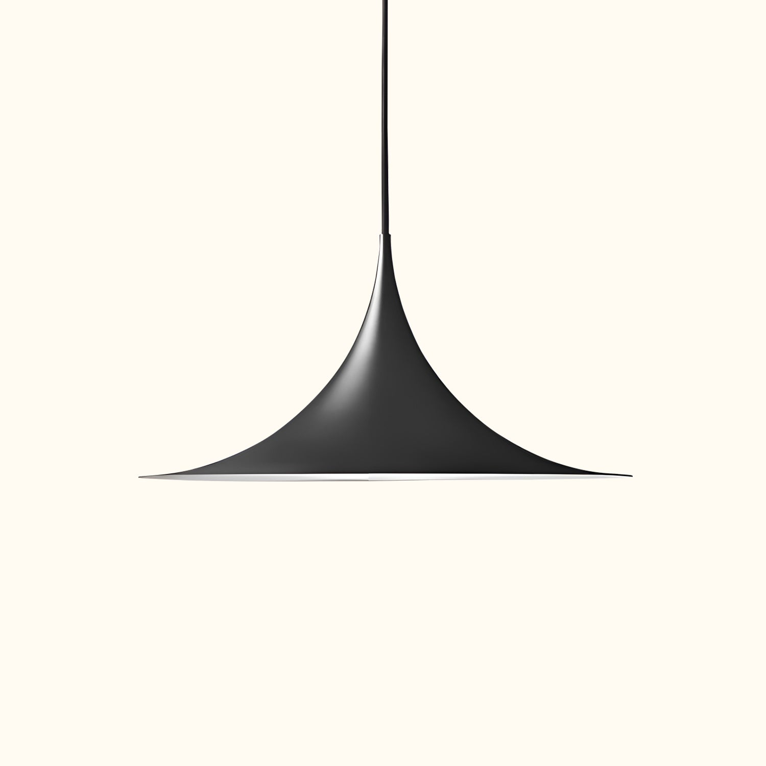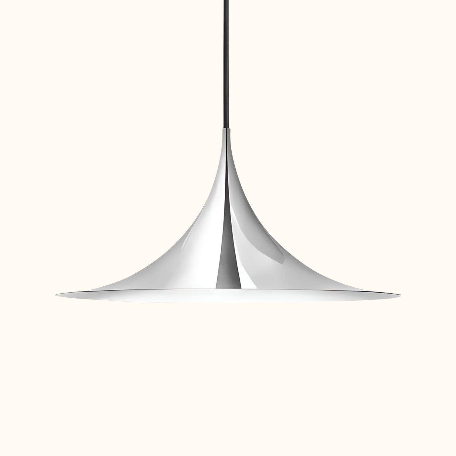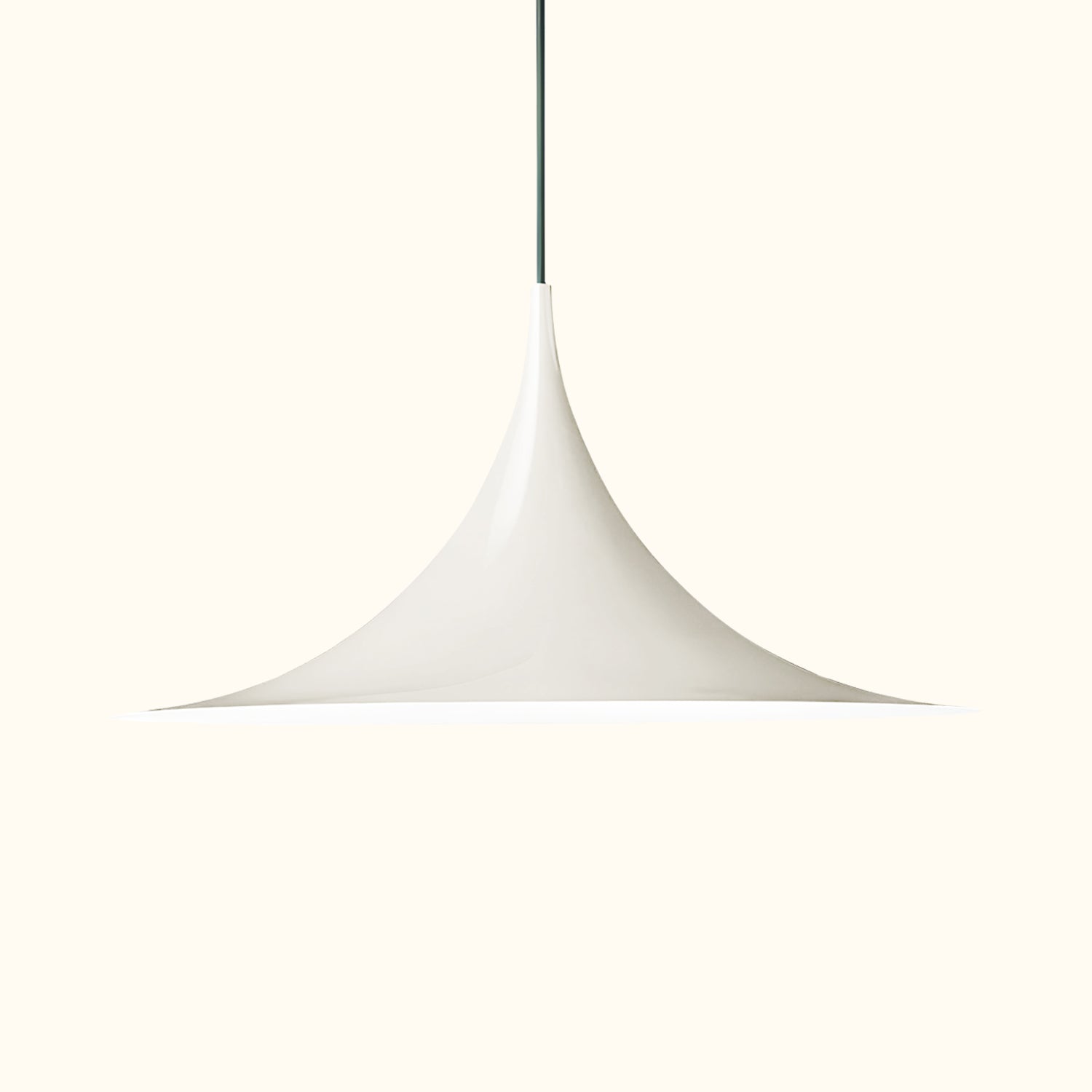 The semi-pendant light serves as both a funnel and a vortex, directing strong downward light through its trumpet-shaped shade. Designed in 1968, this functional light fixture is based on geometric principles; its profile is formed by placing two quarter circles in reverse alignment. The original shape is made of aluminum and then coated with a thick layer of paint or polished to produce pure reflective light.