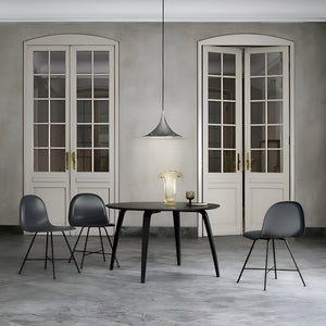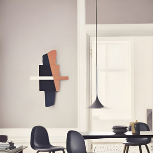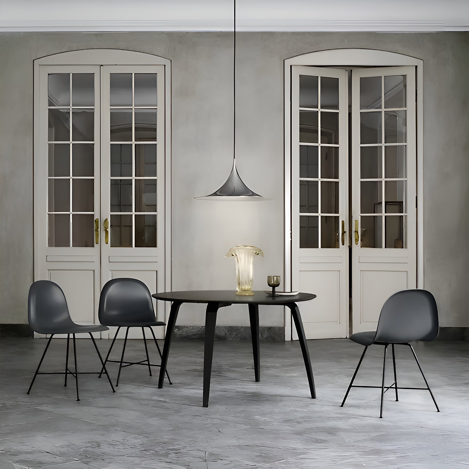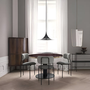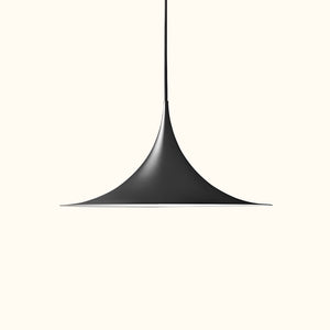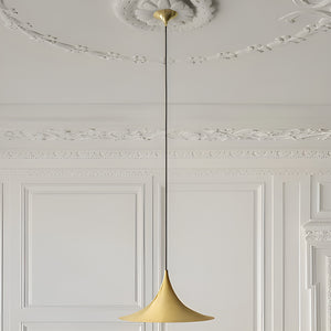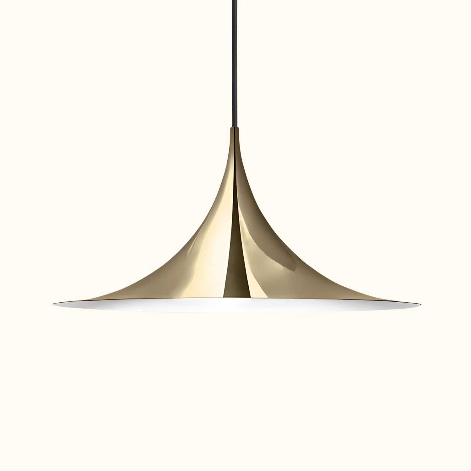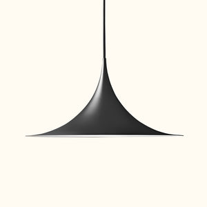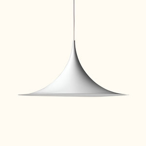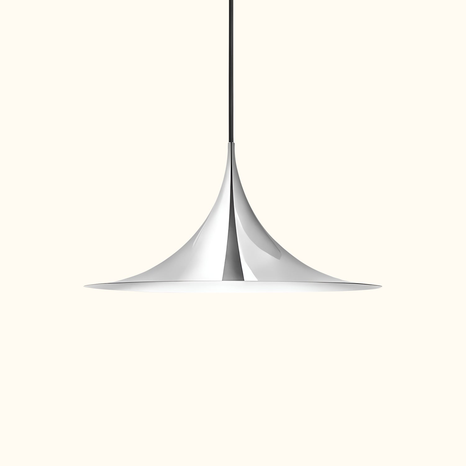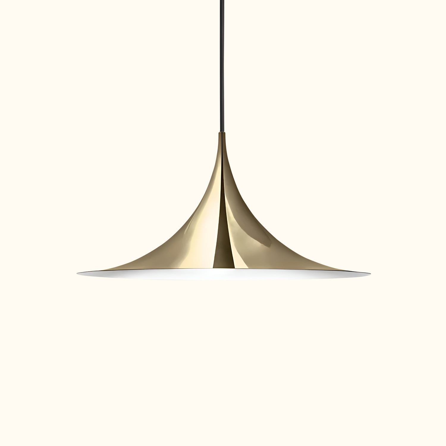 The semi-pendant light serves as both a funnel and a vortex, directing strong downward light through its trumpet-shaped shade. Designed in 1968, this functional light fixture is based on geometric principles; its profile is formed by placing two quarter circles in reverse alignment. The original shape is made of aluminum and then coated with a thick layer of paint or polished to produce pure reflective light.