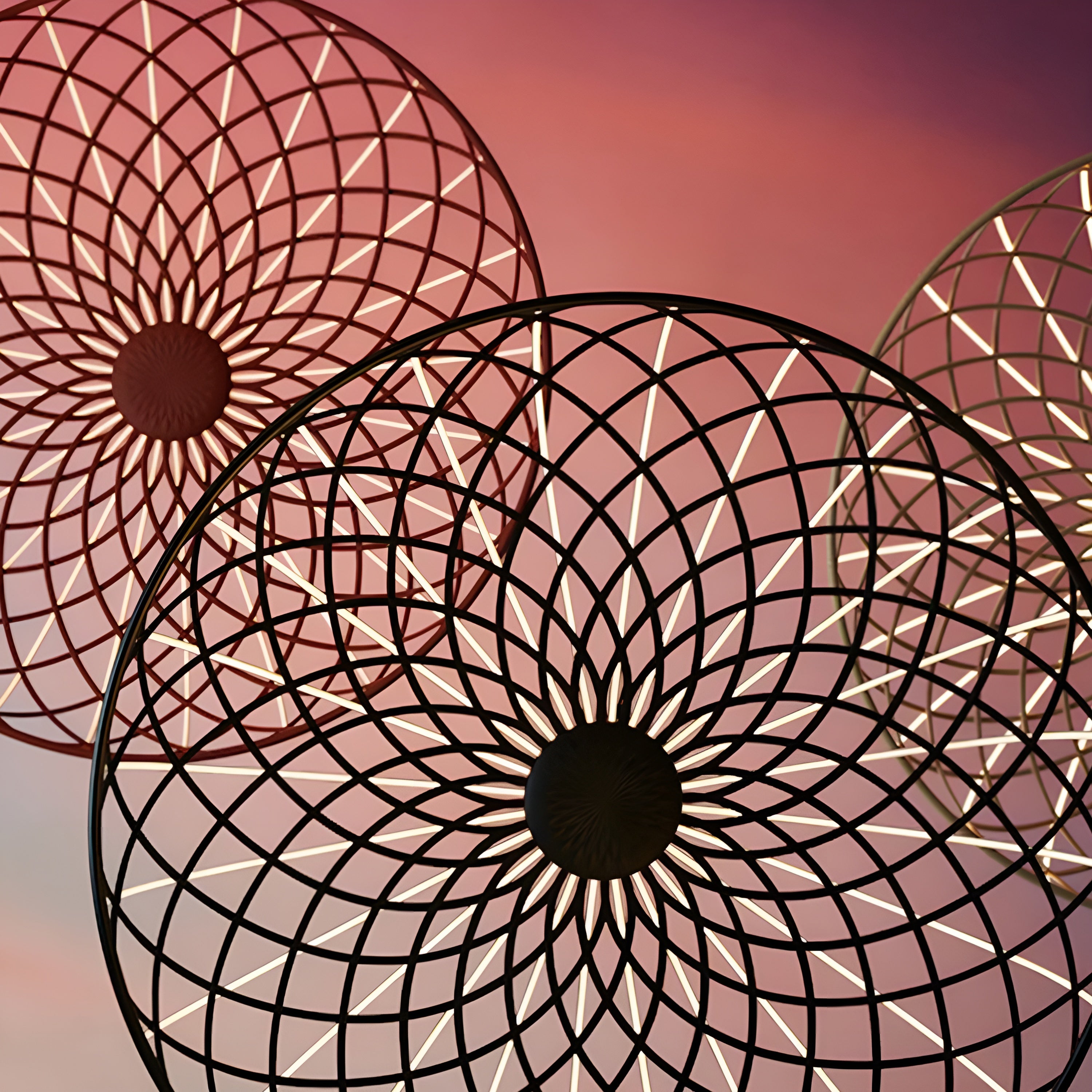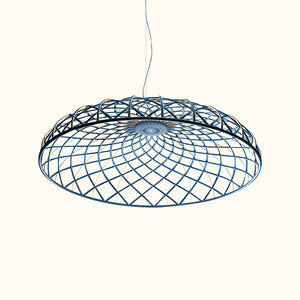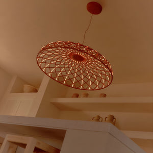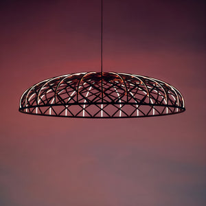 The pendant light features innovative LED strips woven with textile tubes, creating a basket-like shape that is well-crafted and refined.
