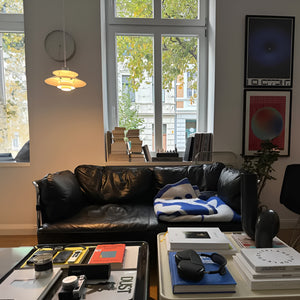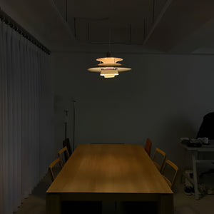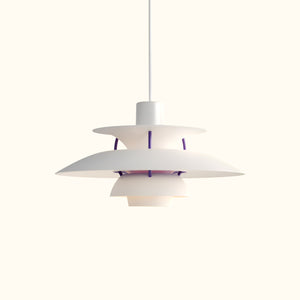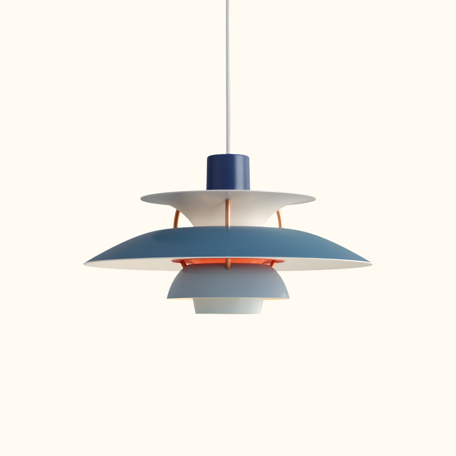 The fixture provides 100% glare-free light. Poul Henningsen developed the PH 5 in 1958 as a follow-up to his renowned three-shade system. The fixture emits light both downwards and sideways, thus illuminating itself. In the PH 5 Classic, a warmer tone of light is created by the internal red cone and a small blue reflector.