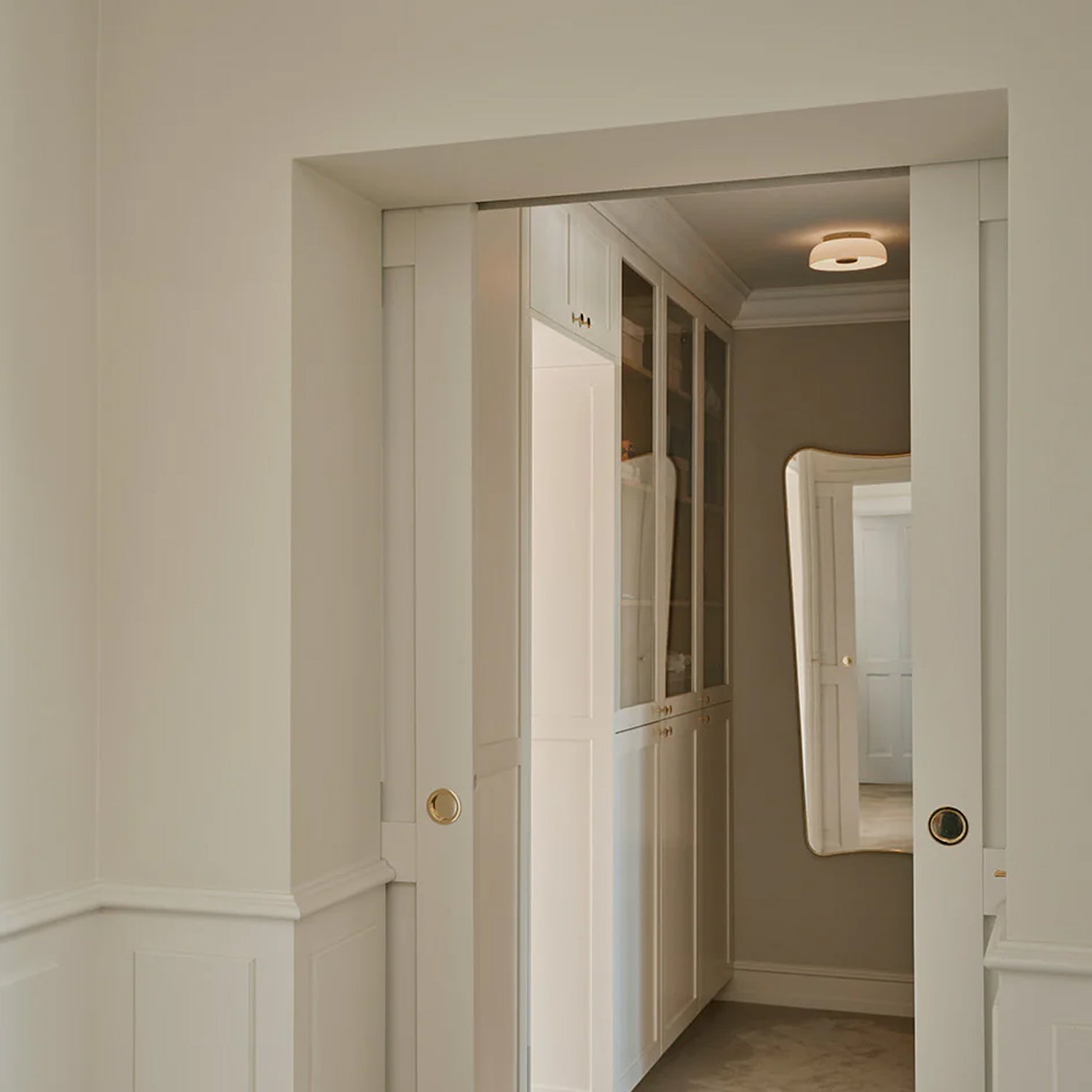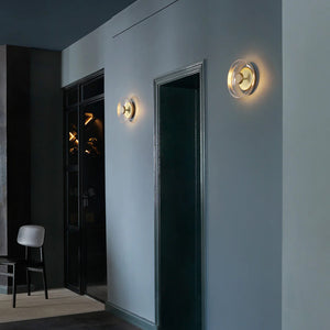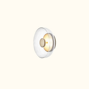 The wall lamp features a simple, circular silhouette. Transparent glass and a golden metal finish provide a soft and delicate lighting effect for the room. The collection uses easily replaceable LED modules that offer flicker-free illumination and comply with the latest EU lighting energy efficiency regulations. The specially developed LED module reflects light within the transparent glass shade, emitting a gentle golden glow.