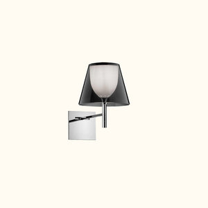 This wall-mounted fixture provides diffuse lighting; a switch located near the diffuser allows for four levels of light adjustment via a "remote" dimmer. The cover rose is made of die-cast, polished, and chrome-plated Zamak alloy. The arms and diffuser brackets are made of polished aluminum. The internal diffuser is made of injection-molded PC (polycarbonate) in an opal color. The external diffuser is available in transparent or smoky PMMA (polymethyl methacrylate) with a silver or bronze finish on the inner surface, achieved through vacuum aluminum coating. The injection-molded PC (polycarbonate) top ring is fully transparent, or the external bronze diffuser can be in a transparent brown color.
