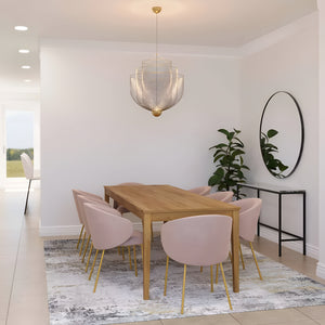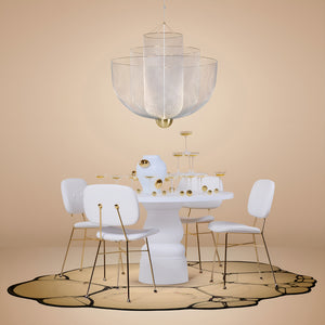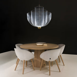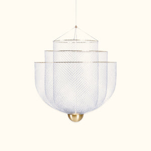 Anyone seeing the Meshmatics chandelier would never guess the intricate design concealed behind its delicate appearance. By developing specialized machinery and tools for precise modeling, the essence of ordinary metal mesh is elevated. The full potential of this thin and flexible material is stretched and captured within three layers of beauty.