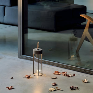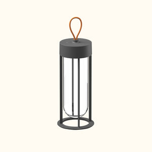 Outdoor wireless rechargeable table lamp that provides diffuse light through an integrated LED source, ensuring a uniform glow.