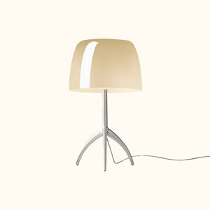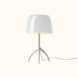 Lumiere is a table lamp made of blown glass and polished or painted aluminum.