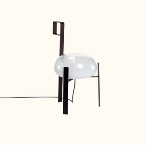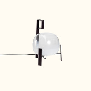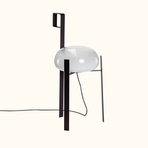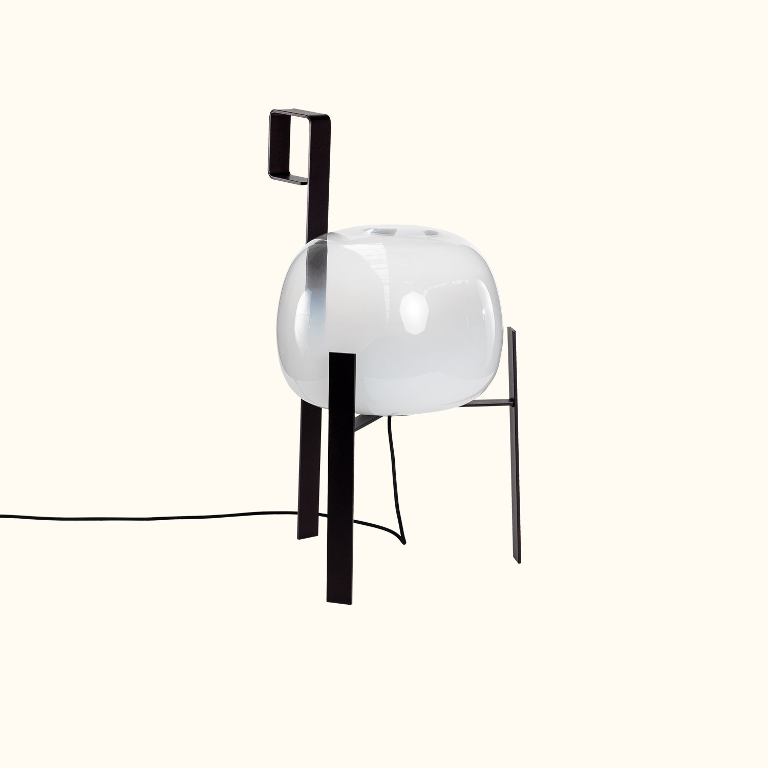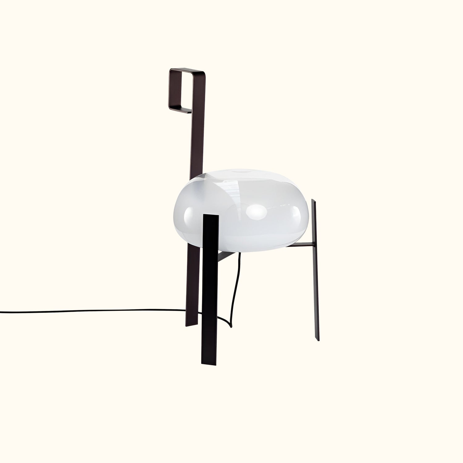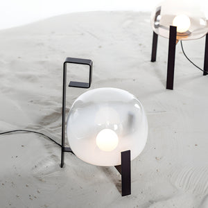 The base is crafted from stainless steel, coated with a fine outdoor powder finish, and paired with hand-blown glass from Italy.