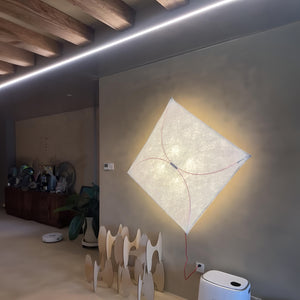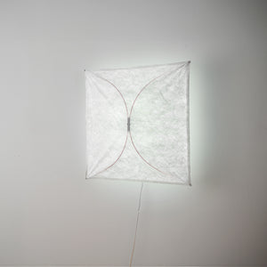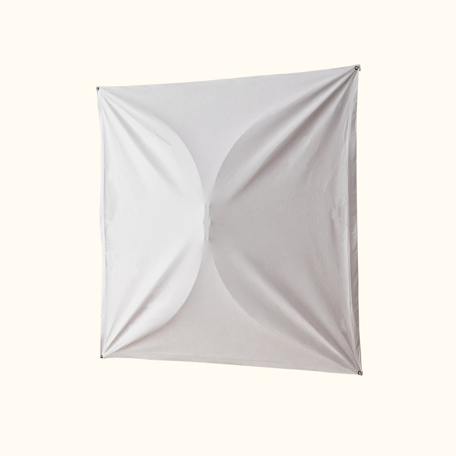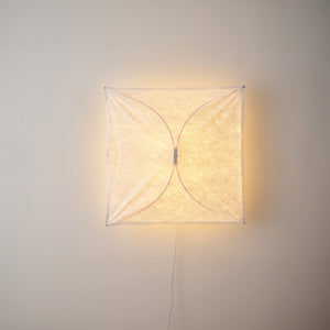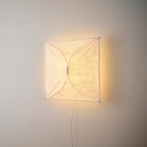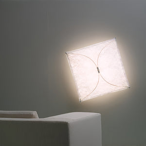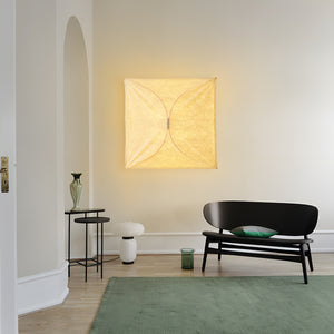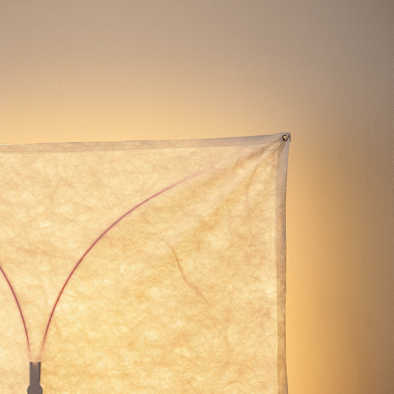 Ariette showcases a linear geometric design that supports an airy fabric diffuser, resulting in a wall-mounted lamp with a gentle, soft aesthetic.