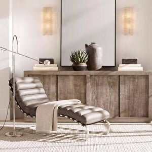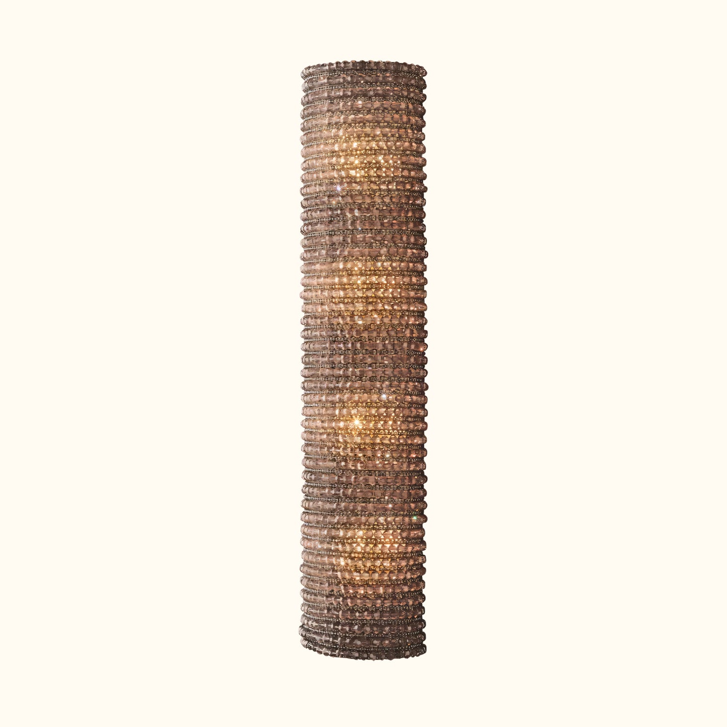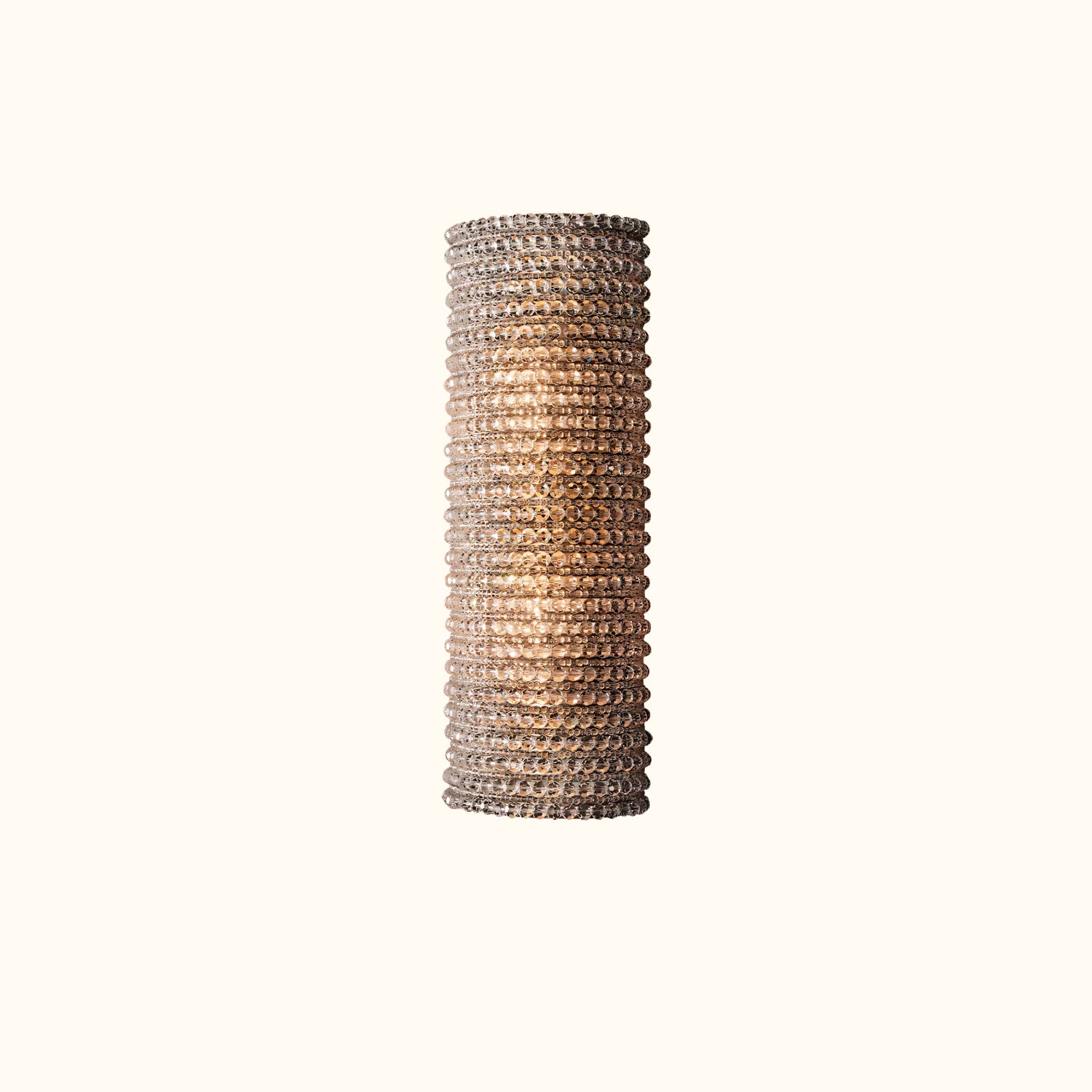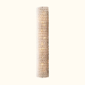 Our sconce echoes the ingenious design of a stunning 1930s French antique chandelier. Thousands of faceted, hand-wrapped crystal glass beads envelop the steel frame, forming a luminous column of refracted light.