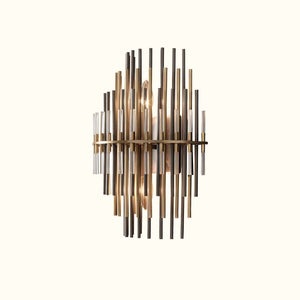 The profile of our sconce is composed of ascending and descending concentric spires, designed by lighting designer and inspired by a 1970s design. Multiple tiers of graduated metal and acrylic rods filter the inner glow, lending the piece a sculptural presence.