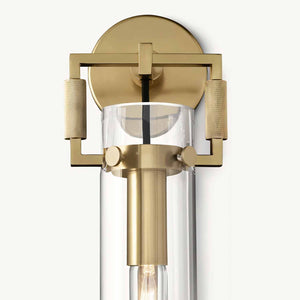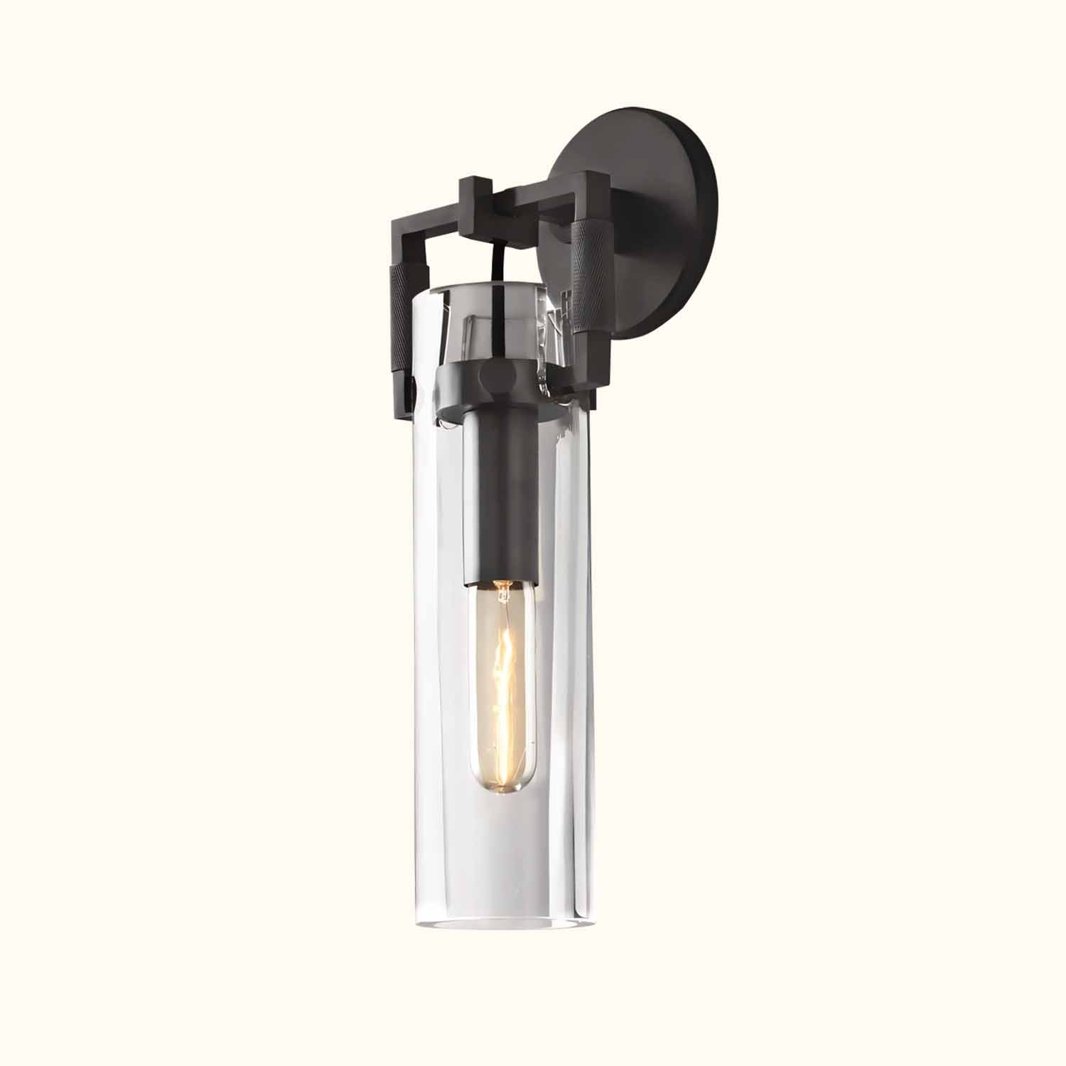 Designed with a focus on positive and negative space, density and openness, strength and fragility, our Machinist wall light explores the concept of yin and yang. The geometric yoke is made from solid metal, highlighting its industrial inspiration. In contrast, the clear glass frame is almost non-existent, echoing the shape of the lampshade. Inside is an Edison bulb that emits a dramatic filament.