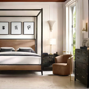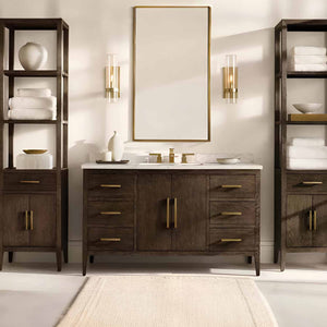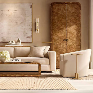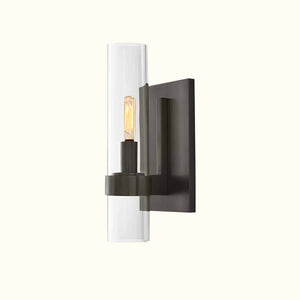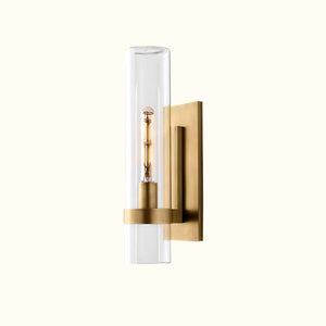 In this collection designed by a renowned lighting designer, Art Deco forms are reimagined with a modern minimalist sensibility. Crafted from solid steel, unadorned metal bands hold the slender glass cylinders in place, achieving a state of perfect balance. Inside each cylinder, Edison bulbs glow like flickering candles.