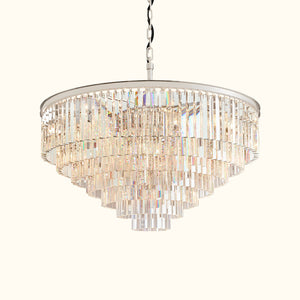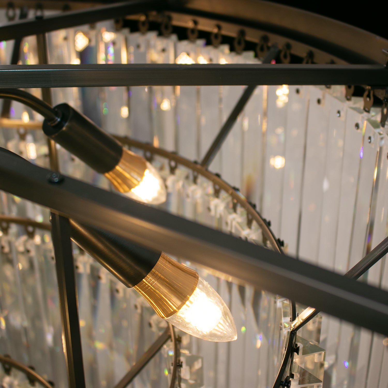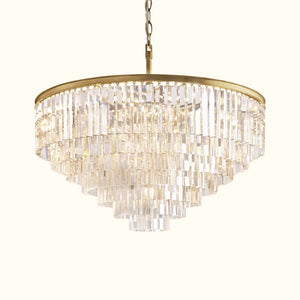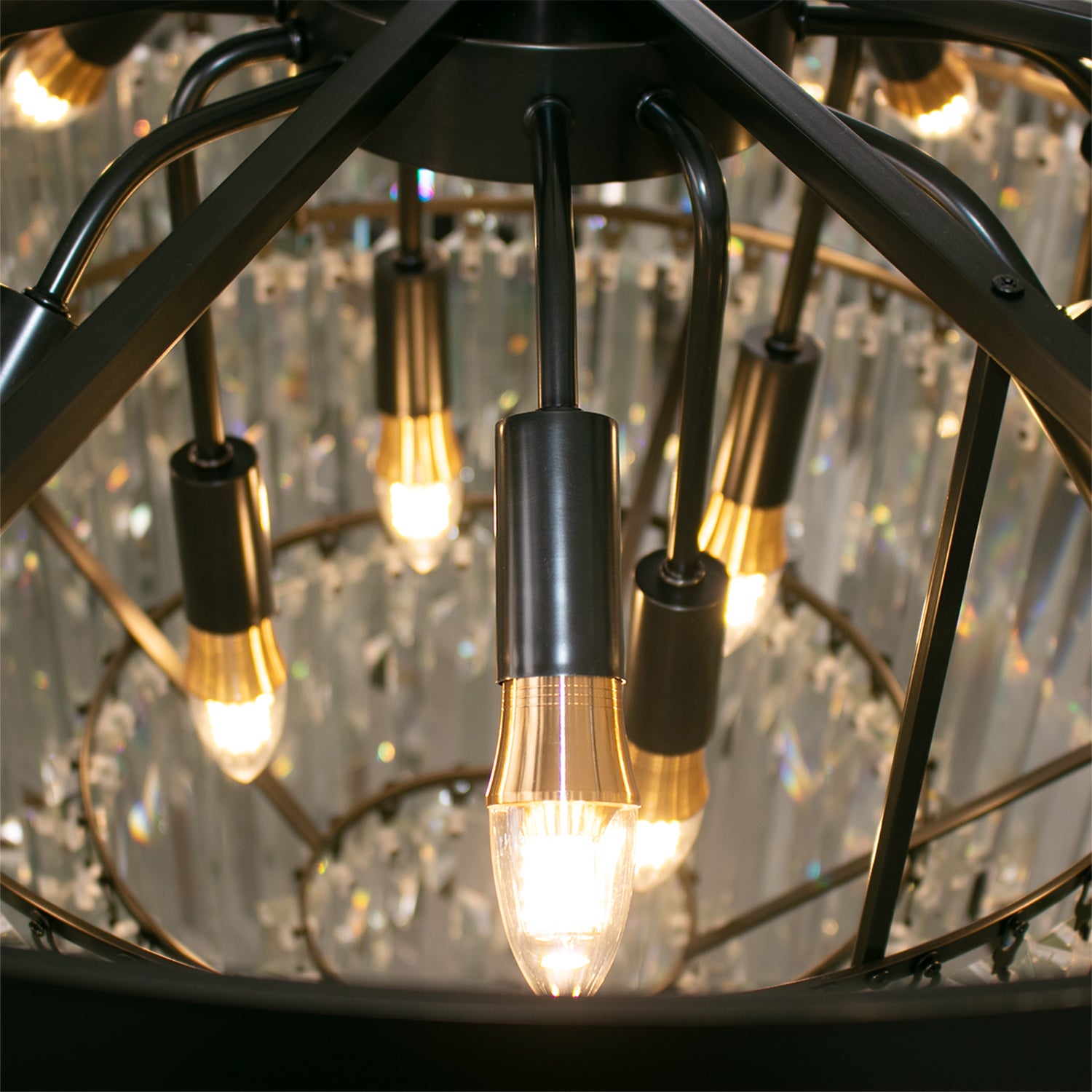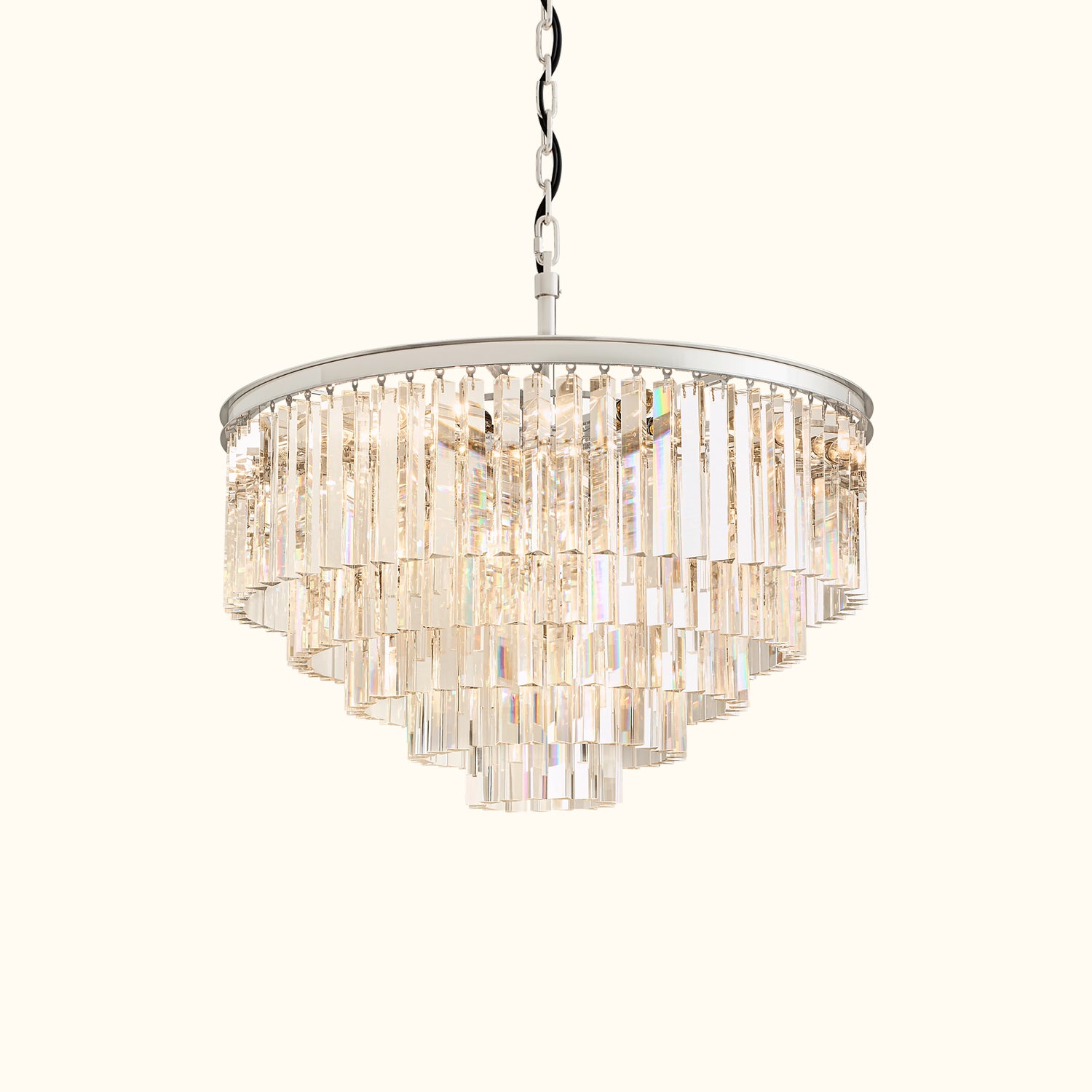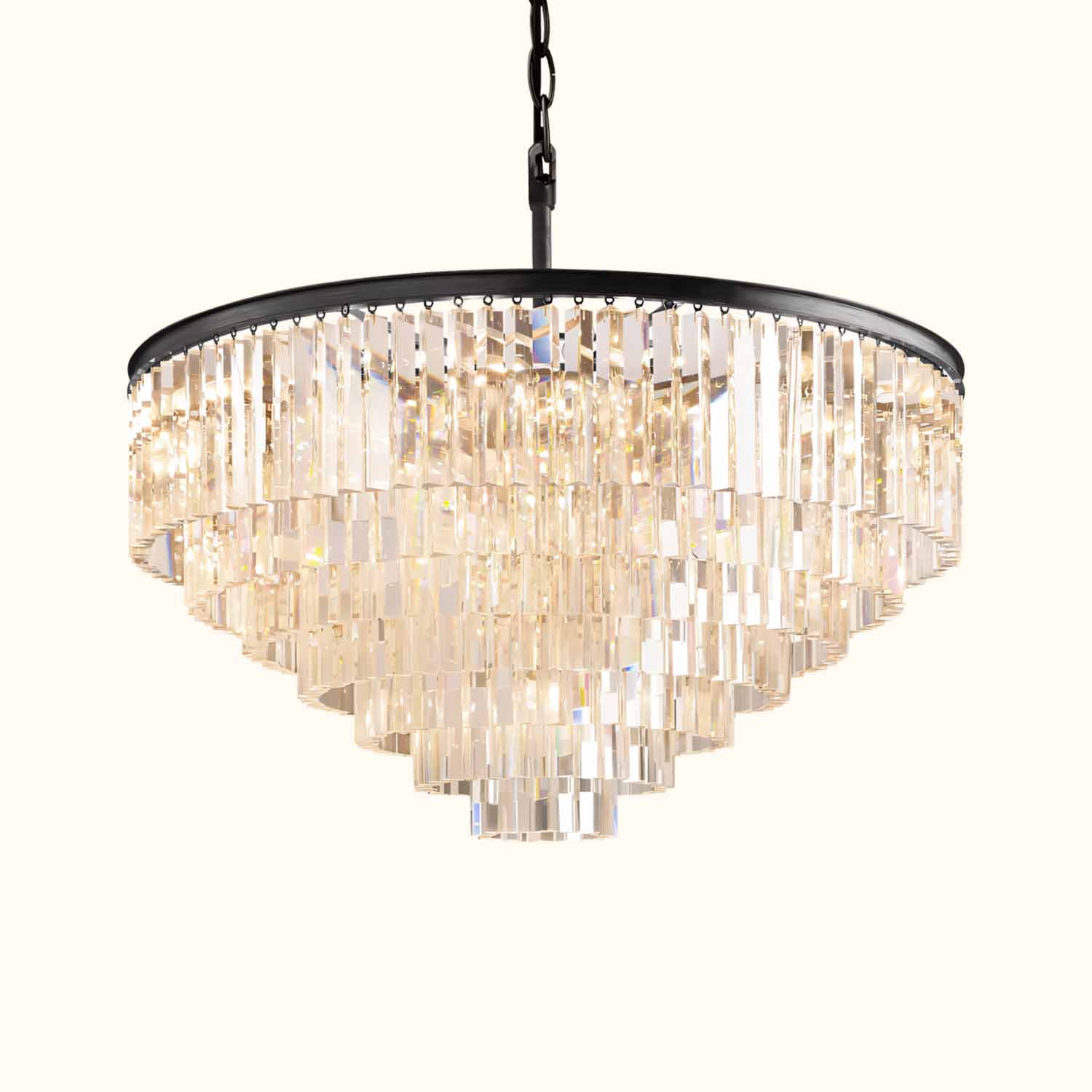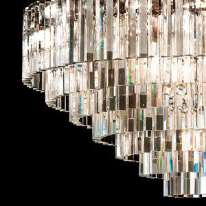 Inspired by the Art Deco style of 1920s Paris, our Timothy Oulton collection captures the era's fascination with geometric shapes. Hundreds of finely cut, dynamic prisms masterfully refract light, evoking the allure of that time. The angular glass hangs like lush fringe from a welded iron frame, perfectly blending elegance with industrial style.