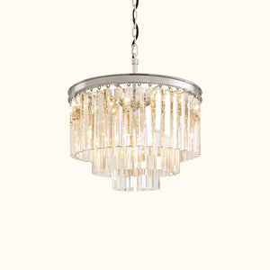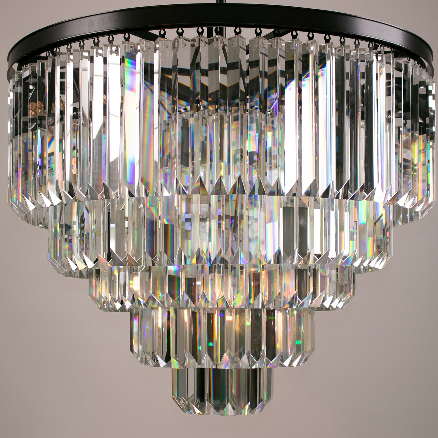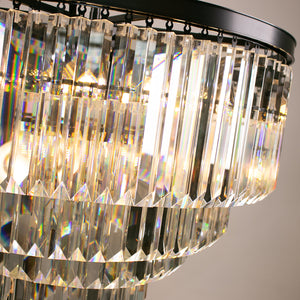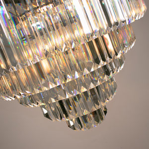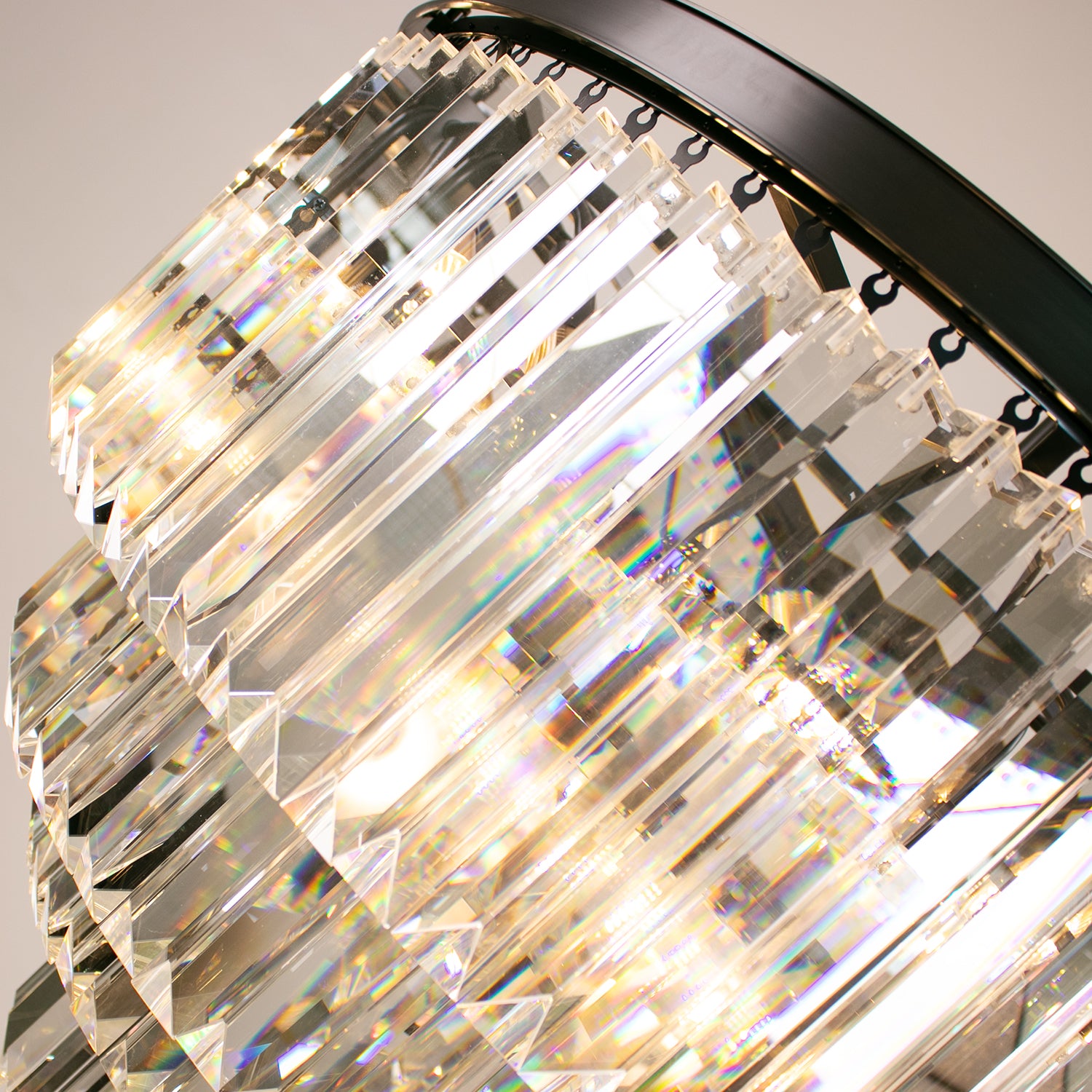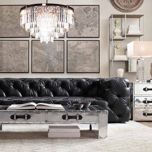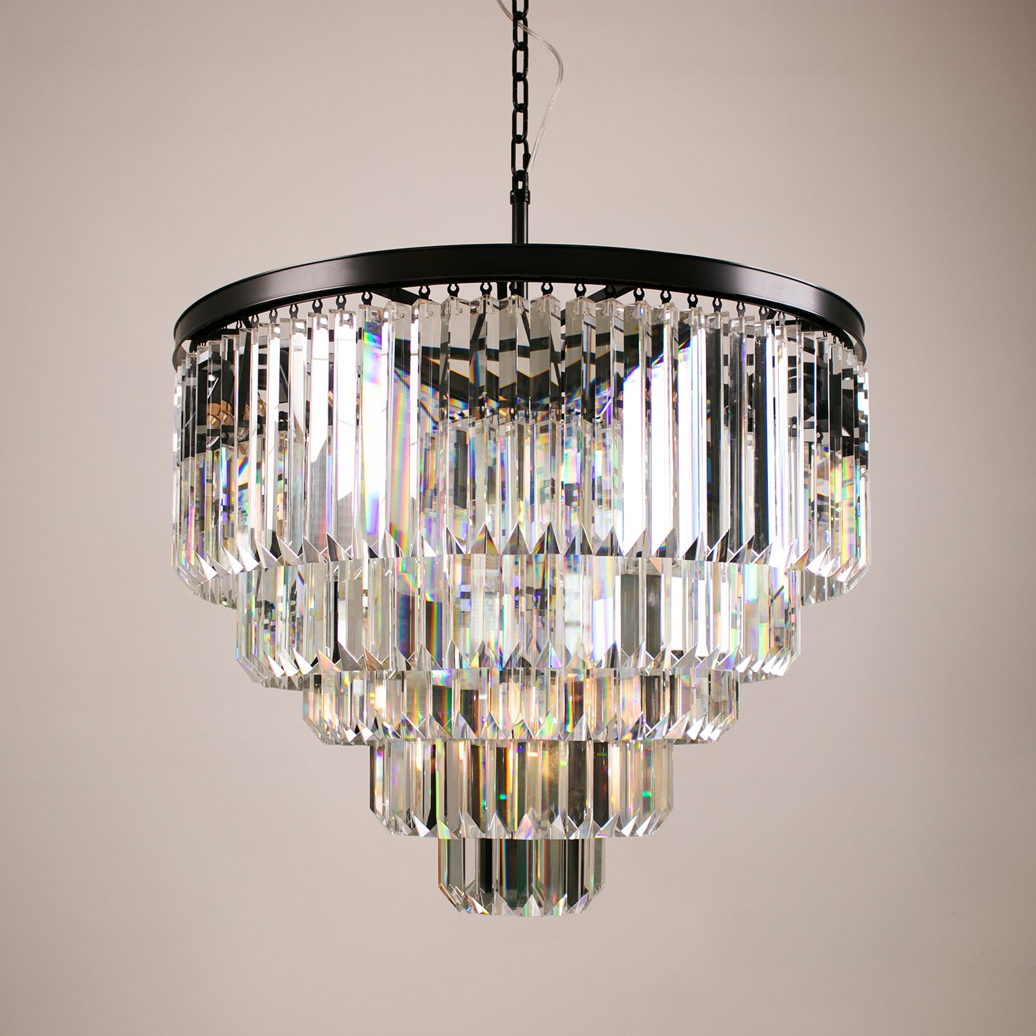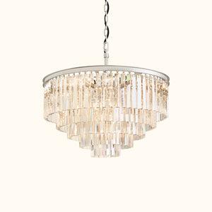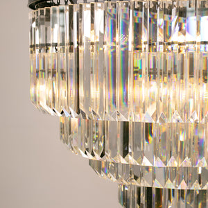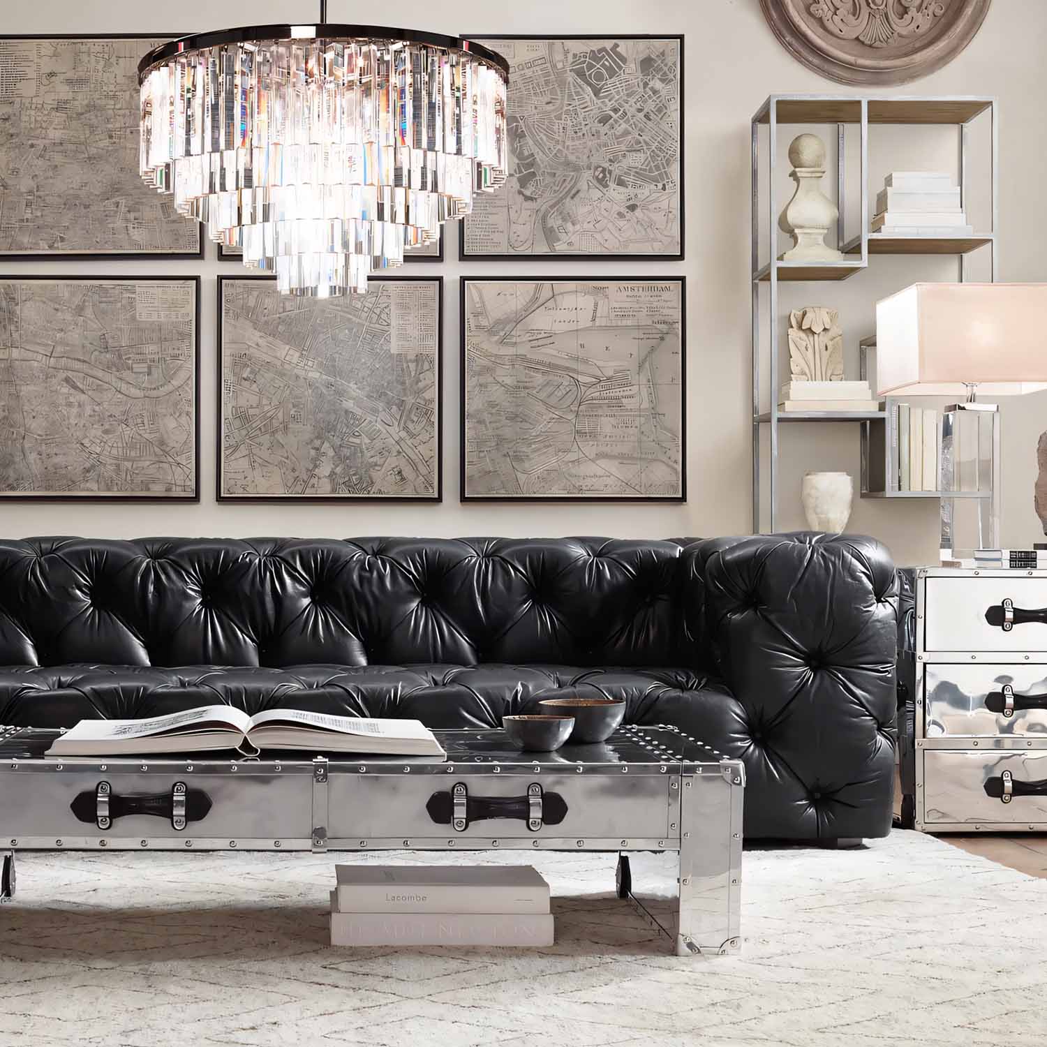 Inspired by the Art Deco style of 1920s Paris, our Timothy Oulton collection captures the era's fascination with geometric shapes. Hundreds of finely cut, dynamic prisms masterfully refract light, evoking the allure of that time. The angular glass hangs like lush fringe from a welded iron frame, perfectly blending elegance with industrial style.
