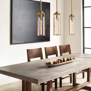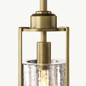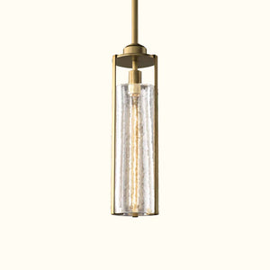 Exploring the aesthetics of textured glass, lighting designer finds beauty in its density, strength and imperfections. Inspired by French cast glass fixtures of the 1940s, Browning captures the look of carved ice that has melted through its proximity to heat. Suspended in a spare, architectural solid brass armature, the geometric shade offers rich textural contrast.