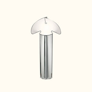 This floor lamp is composed of a reflecting body made of laser-cut stainless steel, finished internally with an opaque white plastic film and folded and closed using hooks formed directly from the sheet metal. A black extruded TPU seal runs along the entire profile of the body. The internal painted steel base is attached to the body for stability and also supports the bulb socket.