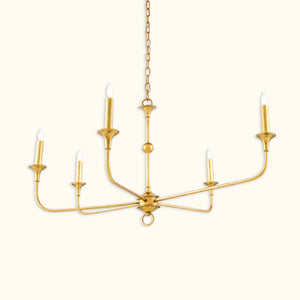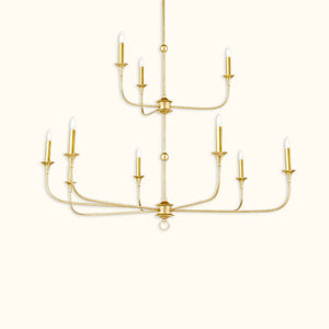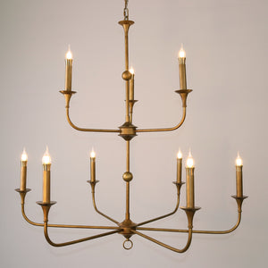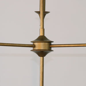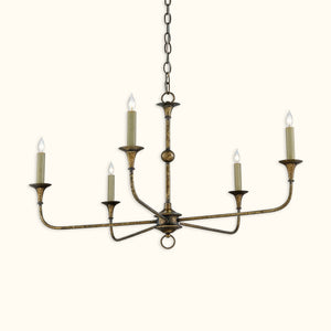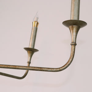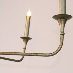 The Nottaway Chandelier showcases a graceful silhouette and timeless design, exuding captivating charm. Its fluid arms extend elegantly from finely crafted cog and ring details, adding a distinctive touch. With a sleek yet dynamic form, it features a hand-applied bronze finish and a hand-distressed gold finish, enhancing its classic appeal while embodying a sense of refined harmony.