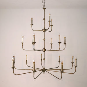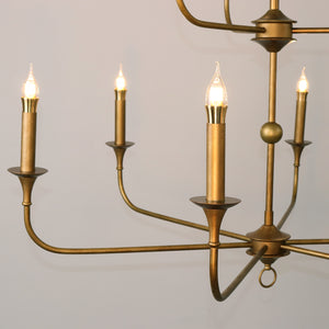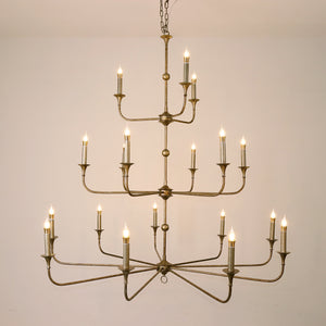 The hand-applied bronze and distressed gold finishes give the chandelier a timeless, vintage appeal, enhancing its luxurious craftsmanship.