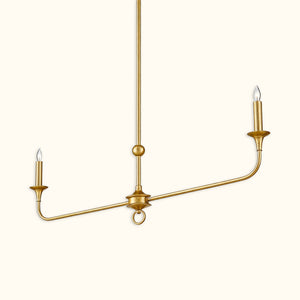 The design highlights of the linear bronze pendant light include long arms that elegantly extend from small gears and a ring that decorates its base. The fixture features a charming fluidity, while the pyrite bronze finish adds texture to the bronze pendant. The fact that the pendant hangs from a rod rather than a chain gives this design a more modern feel, even though it still clearly reflects traditional design elements. Its shape makes it particularly well-suited for placement above kitchen islands and bars.