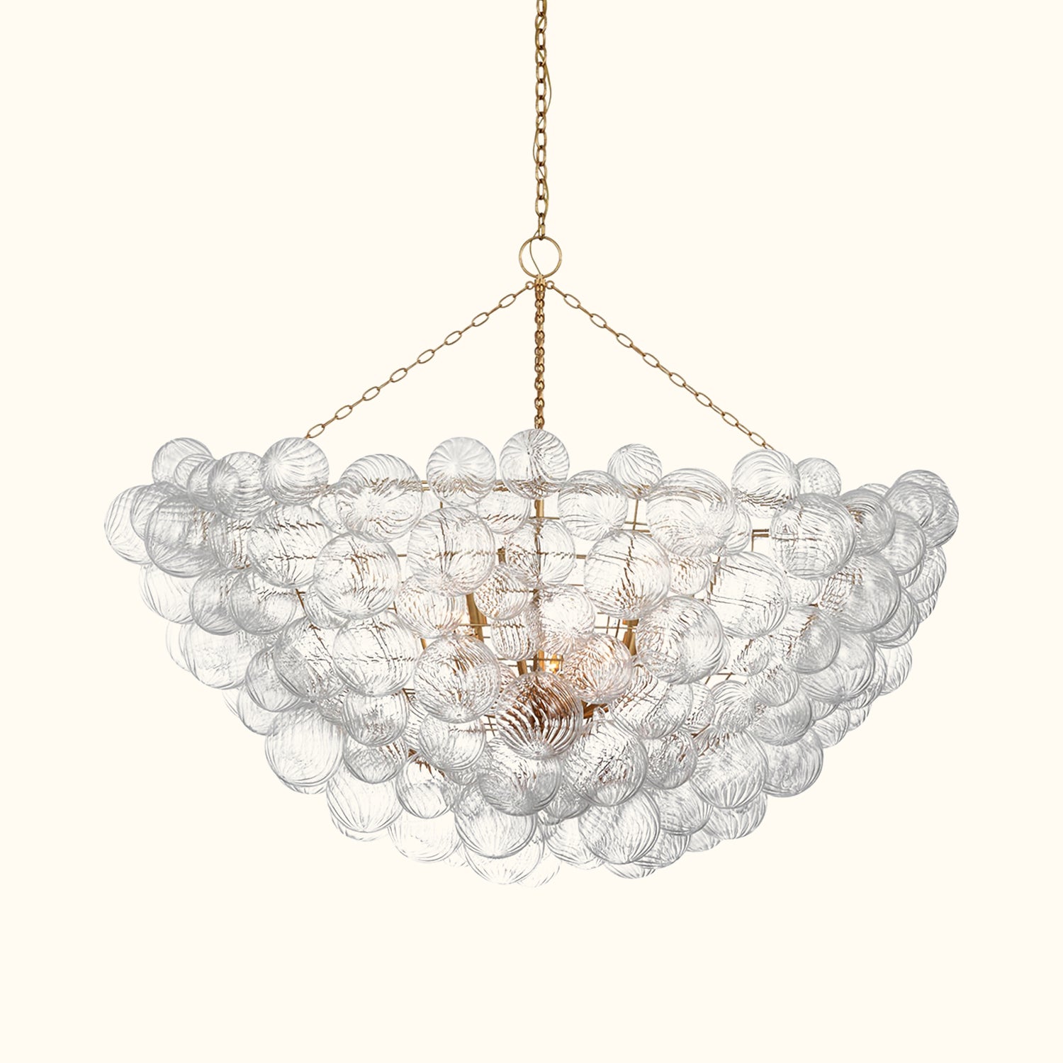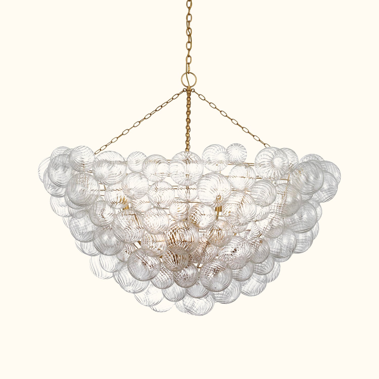 The Talia series, designed with artisanal glass, brings a fresh twist to the simple glass globe light fixture.Light filters through multiple swirling glass orbs, reflecting and intertwining on metal baskets to create a playful accent effect. The Talia series offers a variety of sizes and configurations, adding dynamic sparkling glass, rounded shapes, and bright metallic elements to any interior.Choose a chandelier for entryways and dining areas, a flush-mount, or a wall sconce for living spaces or bedrooms, bringing a touch of playful, feminine elegance to any space.