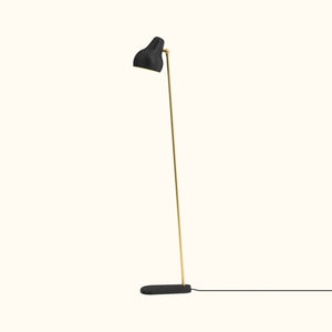 The VL38 floor lamp is based on the original design of the VL38 table lamp. The VL38 table lamp was originally designed in collaboration in the late 1930s for the construction of the Radiohuset building in Copenhagen (now the Royal Danish Academy of Music). The lamp design VL38 and the chandelier VL45 were both created for Radiohuset and began appearing in catalogs in the mid-1940s after World War II. The white/brass version of the VL38 was reintroduced in the fall of 2016. To accommodate contemporary advancements in lighting technology and energy efficiency, the fixture is equipped with LED. The black version of the VL38, launched in the fall of 2017, features a stronger profile compared to the original white version while retaining the beloved retro look and the soft curve expression of the original design.